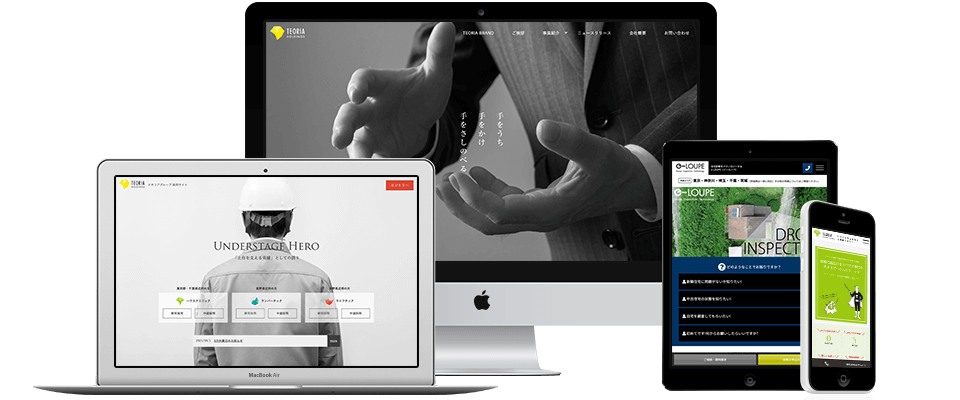 ブランドコンセプトをベースにコーポレートサイト、リクルートサイト、各事業毎のサービスサイト&販促ツールに落とし込み、それぞれに繋がりを持たせて、点から線、そして面の展開を図り、体外的にも内部的にもTEORIAGROUP全体のイメージを確立しております。