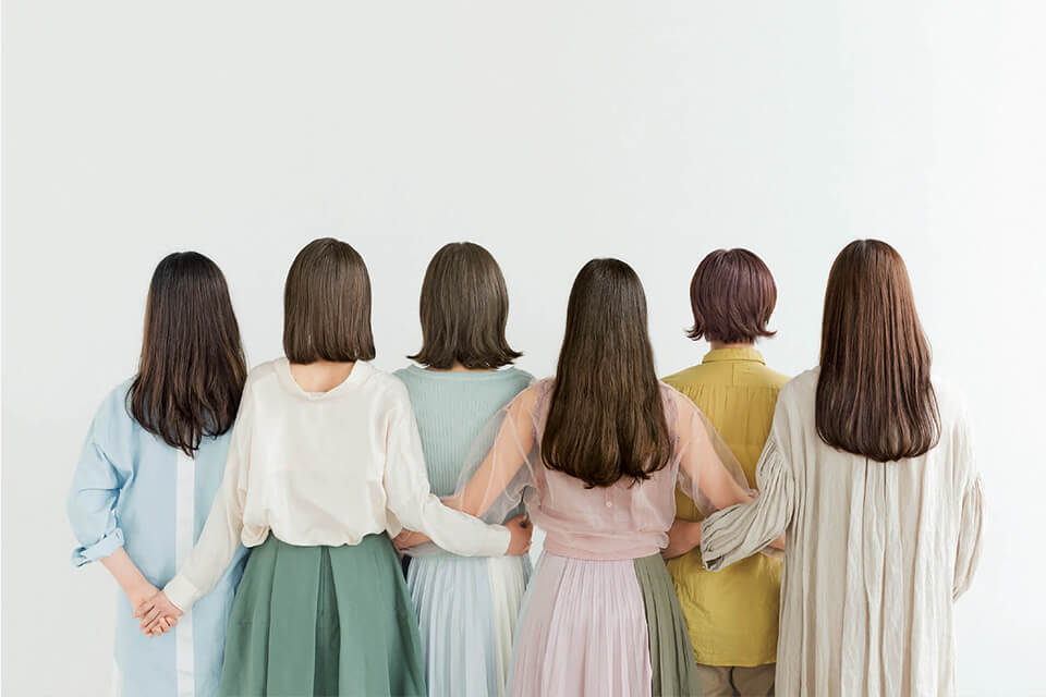 全6色展開となることから、6人それぞれのモデルが後ろ姿で登場。カラーバリエーションの豊富さと、ダメージに配慮しながら、魅力的な色と艶を実現する抗酸化安定処方※のヘアカラーとして絶妙なトーンを各専門のクリエイターと探りました。