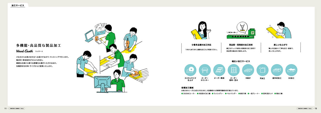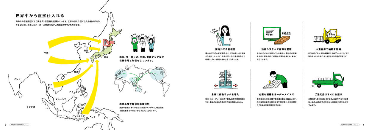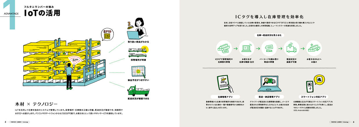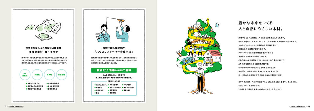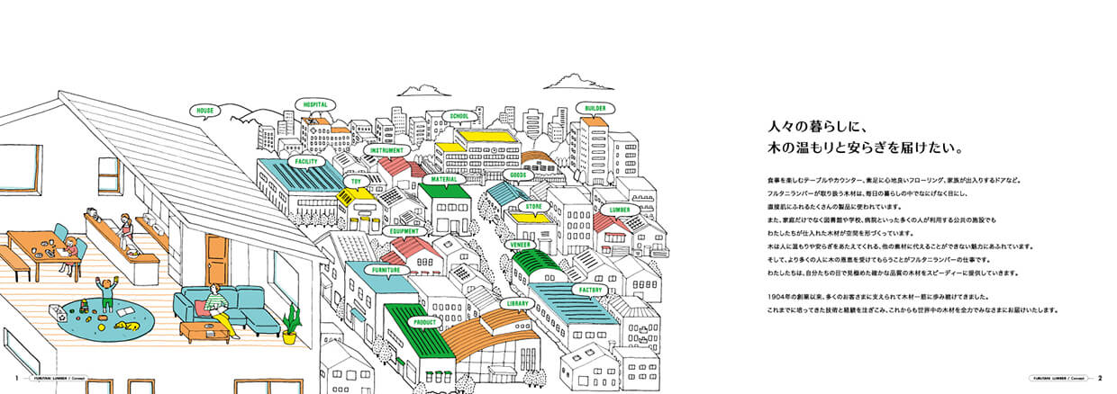 またブランドブックでは業界独自の専門的な表現や細かい製品情報の露出を控え、イラストを中心として誰もが分かりやすい見せ方で様々なコンテンツを網羅。社員様全員が家庭に持ち帰っていただきご家族が会社のことをより深く良く知ることに繋がりました。