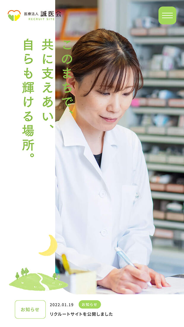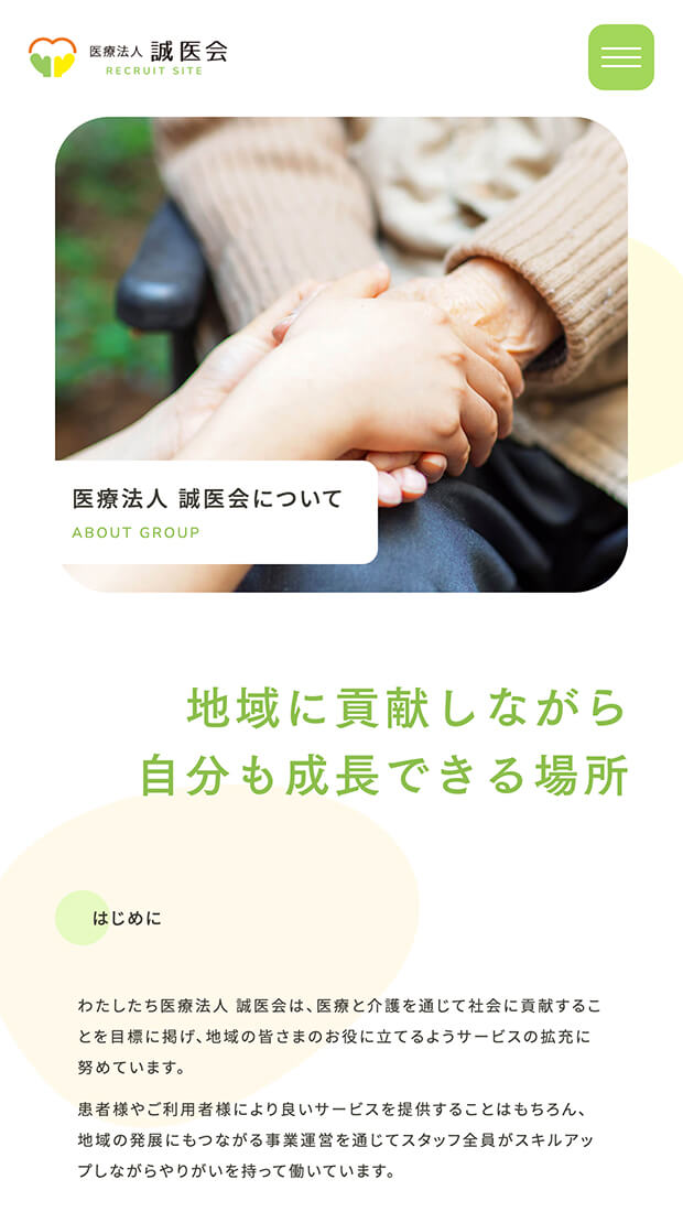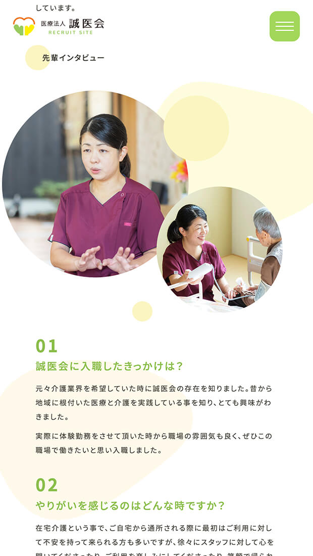 採用サイトでは各職種での求職者の方がイメージを抱きやすいように実際に働く先輩方のリアルな声や一日のスケジュールなどの情報を充実させ、デザインもより柔らかく温かい雰囲気にしております。