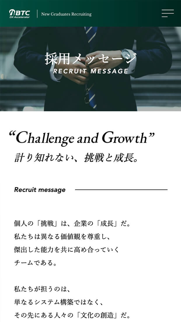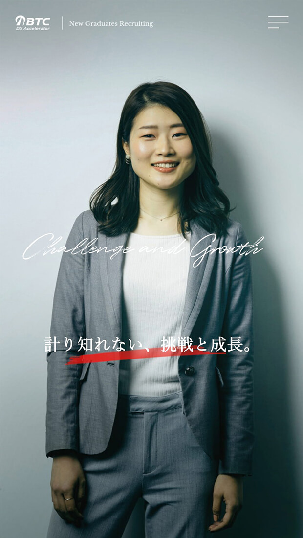 テクノロジーとコンサルティングの融合を最大の強みに、挑戦と成長を続ける株式会社ビッグツリーテクノロジー&コンサルティング様。「Challenge&Growth」をリクルートメッセージとした新卒採用ブランドを立ち上げました。 新卒者にとって、近い将来(3~5年後)がイメージできるよう、 先輩社員のリアルをキービジュアルに、見据える世界観をデザインとコンテンツに落とし込んでおります。