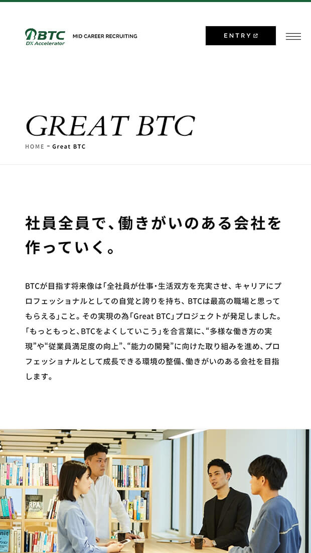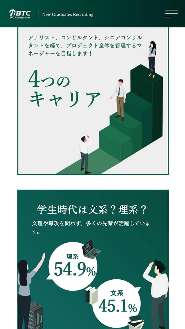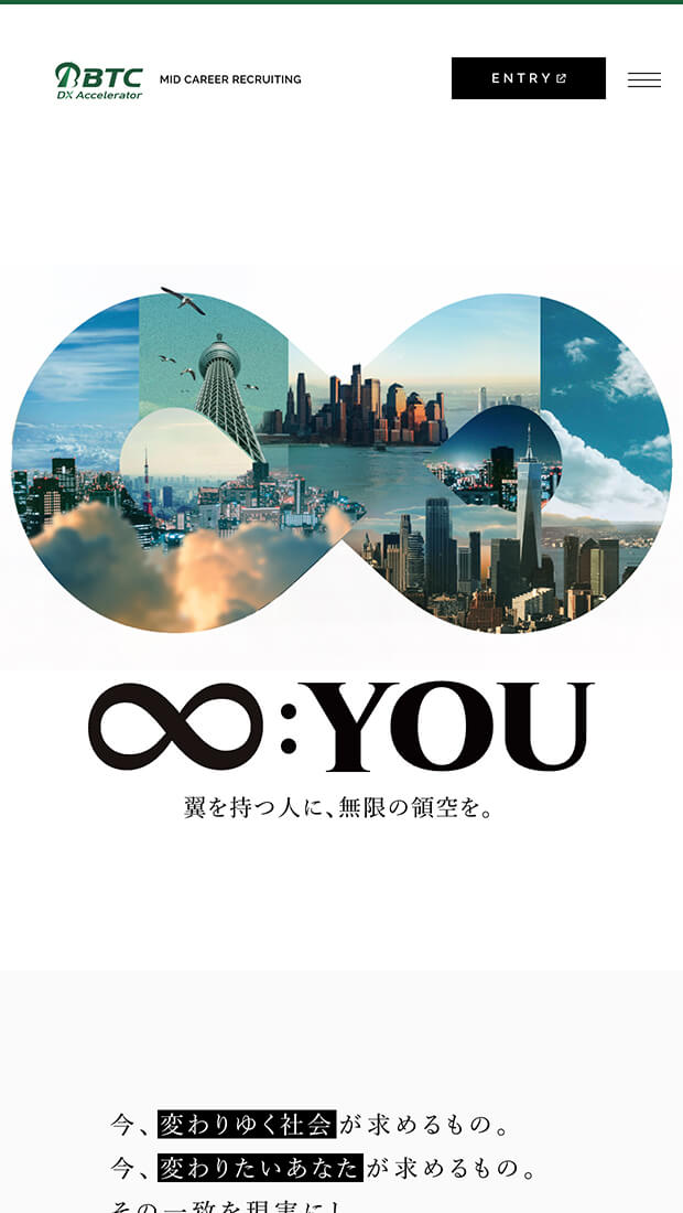 中途採用では「∞:YOU/翼を持つ人に、無限の領空を。」の採用キャッチコピーを立ち上げ、サイトを構築しました。無限に広がるBTCのフィールドで、DXの開拓者として共に挑戦する未来の仲間たちに訴求するメッセージングを込めています。魅力的な社内の取り組みや制度を事細かに紹介しながら、中途採用ブランドの世界観を表現しています。