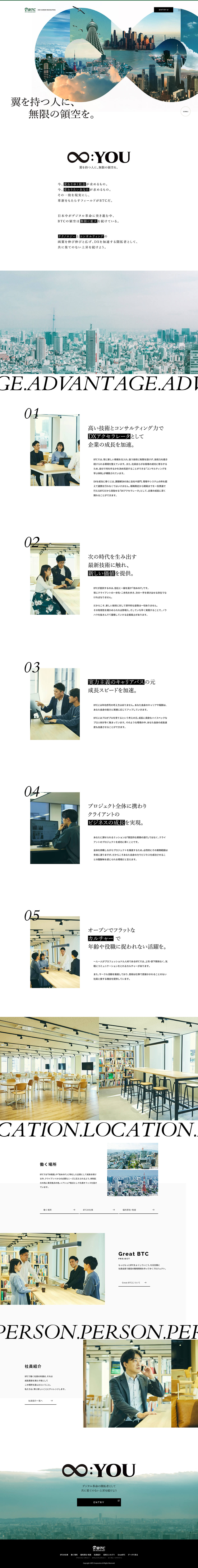 中途採用では「∞:YOU/翼を持つ人に、無限の領空を。」の採用キャッチコピーを立ち上げ、サイトを構築しました。無限に広がるBTCのフィールドで、DXの開拓者として共に挑戦する未来の仲間たちに訴求するメッセージングを込めています。魅力的な社内の取り組みや制度を事細かに紹介しながら、中途採用ブランドの世界観を表現しています。