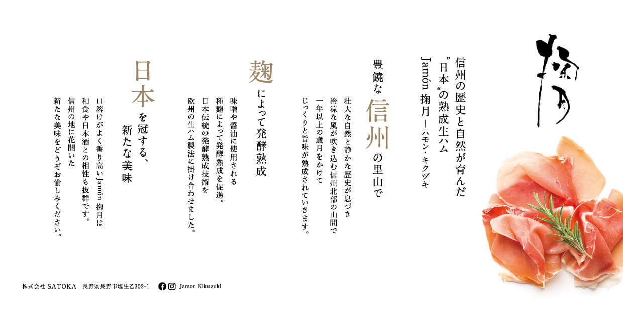 株式会社SATOKA様が「長野の気候や食文化を活かし時間の経過が価値になるものを作りたい」との想いでスタートさせた日本製生ハム「jamon掬月」の製造販売事業をブランド立ち上げからお手伝いさせていただきました。