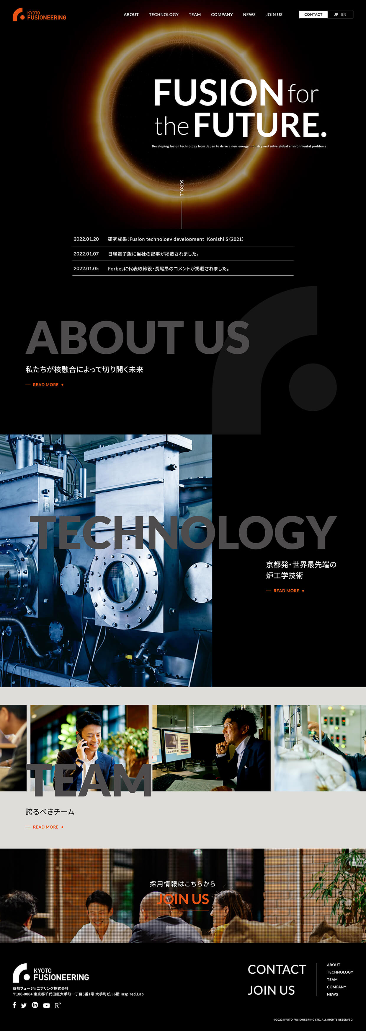 私たちが生きる上で密接に関わってくるエネルギー問題。京都フュージョニアリング様はその地球課題に対して、究極的なエネルギーソリューション「核融合」によって人類に新たな未来をもたらすことを志しています。その想いや組織の価値を一貫したブランドメッセージに乗せて、ロゴやコーポレートサイトに展開しています。