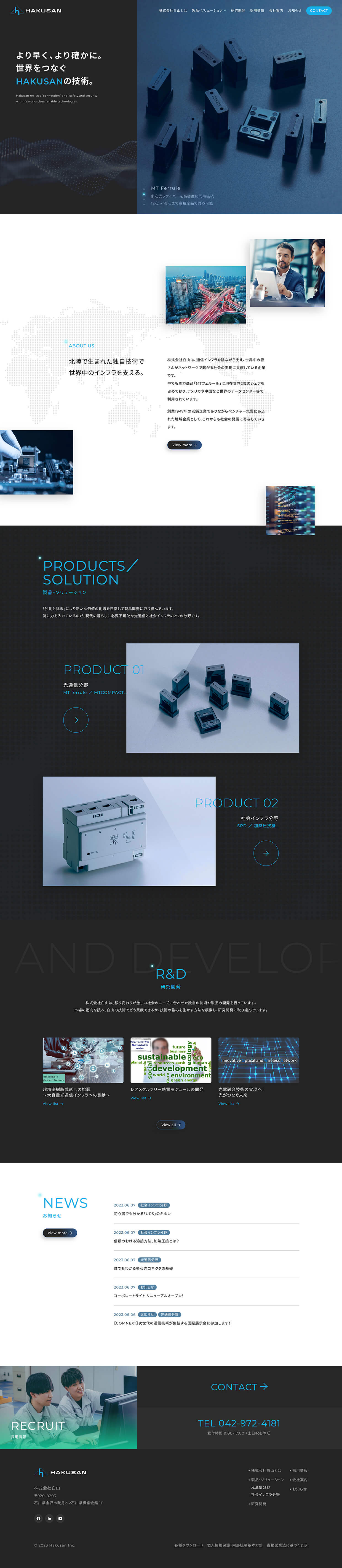 世界中がネットワークで繋がる社会の実現に貢献している光通信関連メーカー、株式会社白山様のコーポレートサイトと会社案内の制作をご依頼いただきました。創業1947年の老舗企業でありながらも、ベンチャー気質にあふれた地域企業として社会の発展に寄与しています。