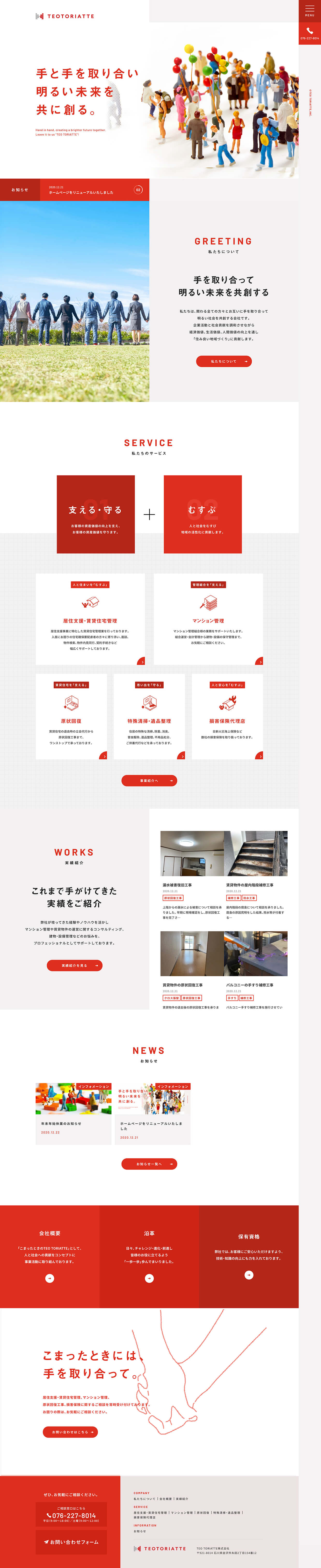 石川県金沢市でマンション管理や居住支援・賃貸住宅管理など人々の暮らしにまつわる様々なサービスを展開されているTEO TORIATTE株式会社様。ロゴは、社名やタグラインにもなっている「手と手を取り合う」をイメージしデザイン。またコーポレートサイトは企業カラーでもある赤を基調とし、社会貢献にかける情熱や人と人とがつながるワクワク感を表現しました。