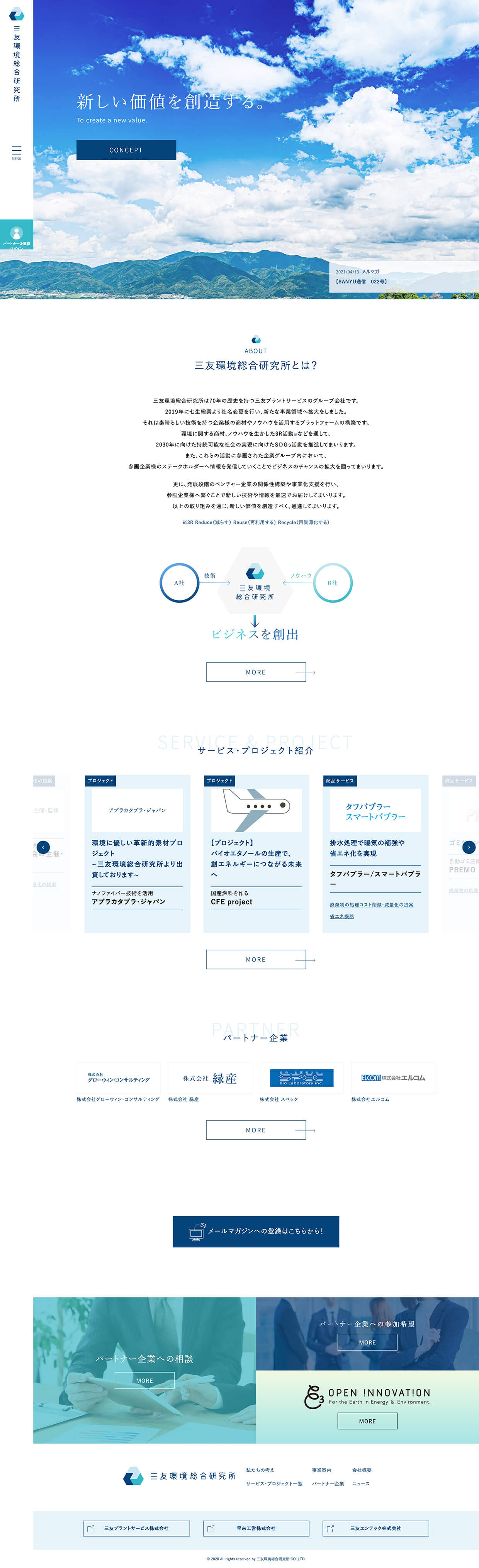 70年の歴史を持つ三友プラントサービスのグループ会社である、「三友環境総合研究所」様のロゴマークとコーポレートサイトを制作させていただきました。三友環境総合研究所様は環境に関する優れた商材やノウハウを持つパートナー企業様とともに持続可能な社会の実現に向けたSDGs活動を推進されております。コーポレートサイトでは、三友環境総合研究所様の考えや事業内容の他に、優れた技術を持つパートナー企業様や各種商材をご紹介。