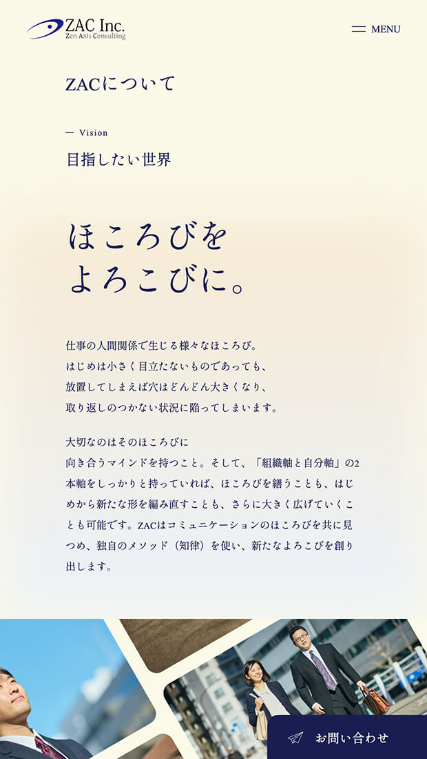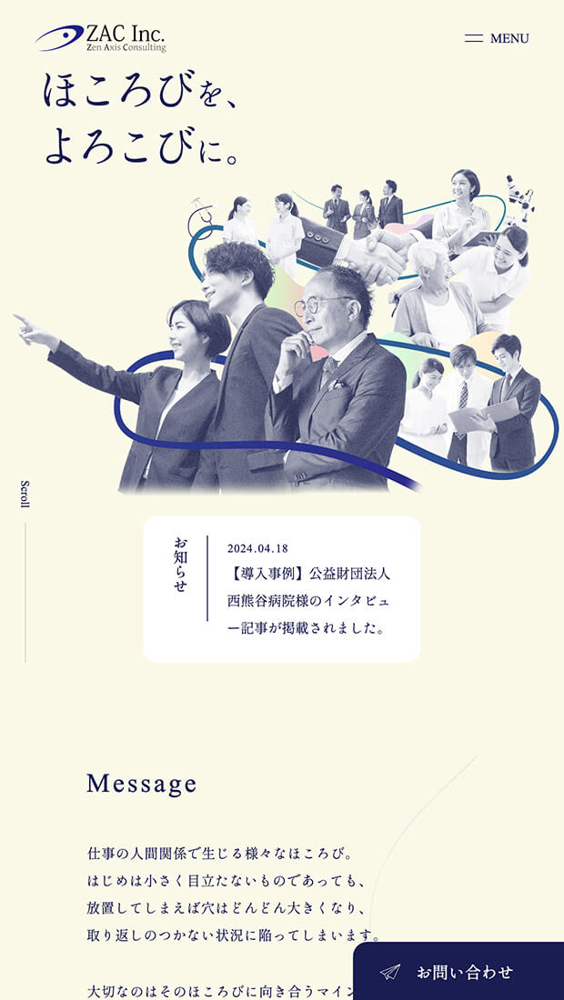 株式会社ZAC様は、医療介護業界を中心とした組織のコミュケーション課題解決を目的に、評価・賃金制度をはじめとした多岐にわたるコンサティング事業を展開する会社です。この度ブランド設計・コンセプト開発をはじめ、コーポレートサイトのリニューアルをお手伝いさせていただきました。
