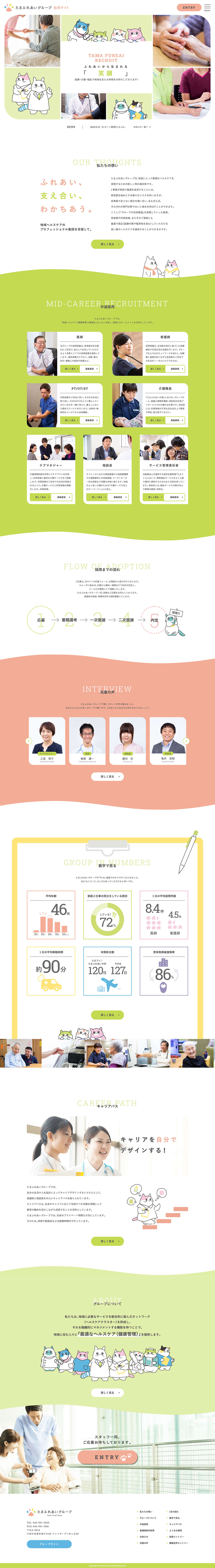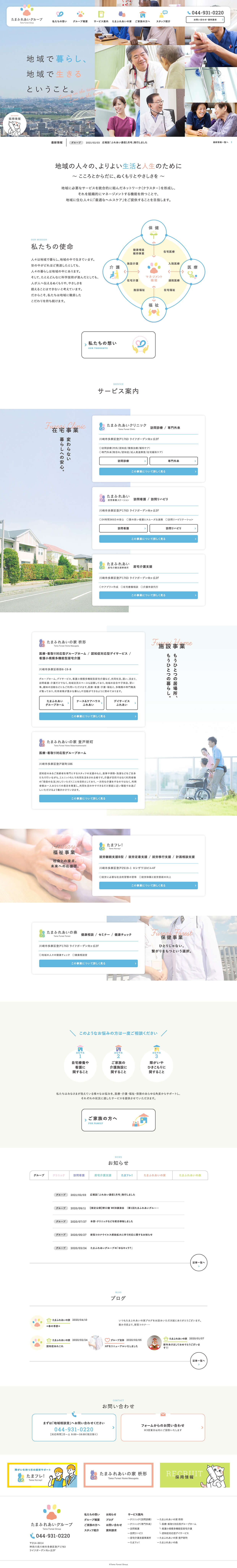 川崎市多摩区を中心に訪問診療や訪問看護を行なう「たまふれあいグループ」様。居宅介護事業所や訪問看護と連携することで在宅で過ごす患者様やご家族を医療・介護を含め総合的に支えられております。今回、グループ全体のブランディングをご依頼いただき、メディカルブランディングに基づき、全体ブランド設計からロゴ、キャラクター、WEBサイト各種制作まで行なっております。地域に住む人々への「最適なヘルスケア(健康管理)」構想のお役になれることを願っております。