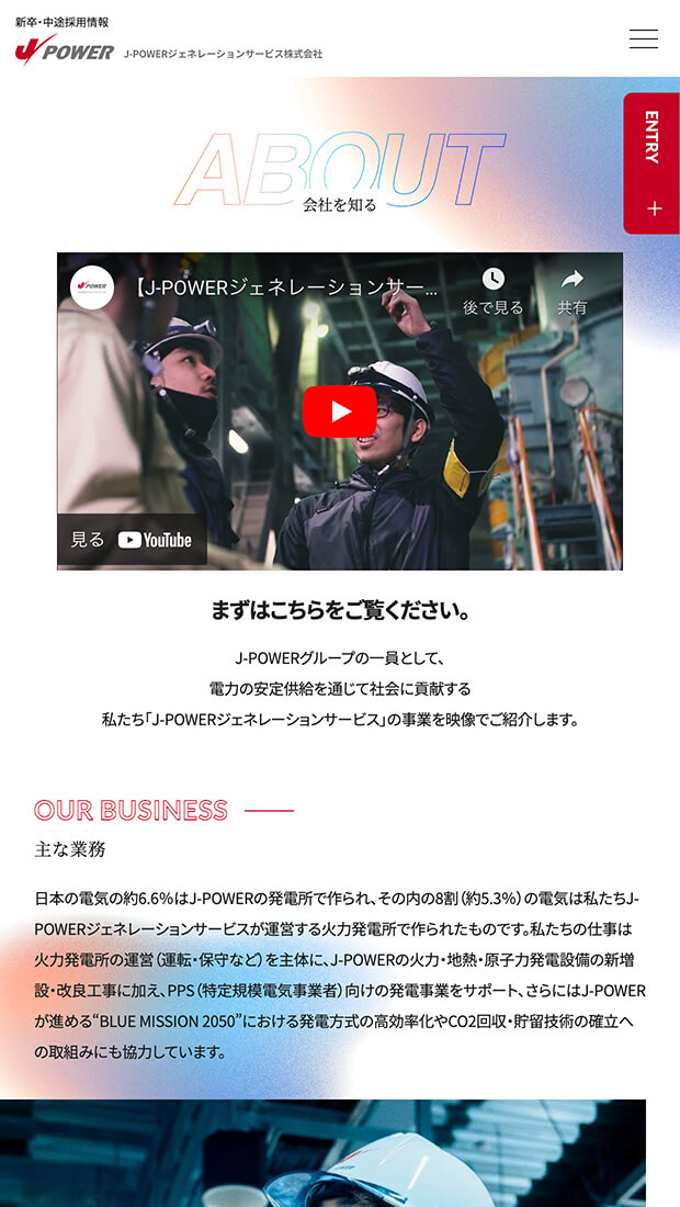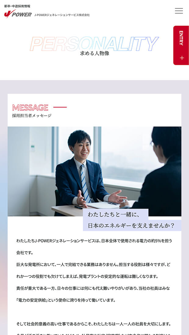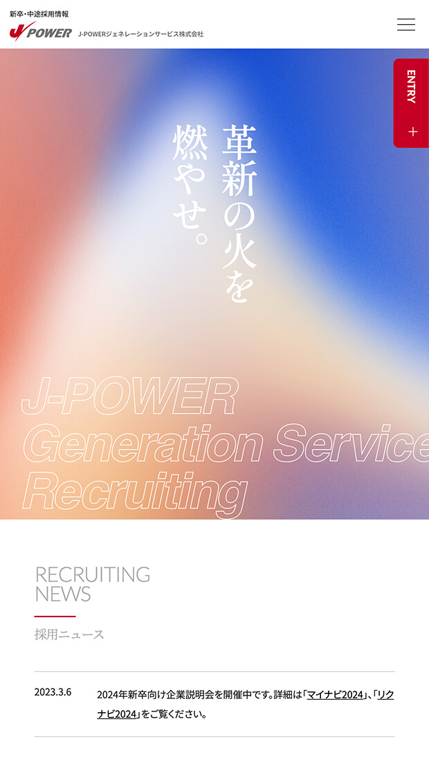 リクルートサイトは抽象的な揺らめくグラデーションをキービジュアルに用いることで、コアビジネスである火力発電と未来への明るい展望=夜明けを表現。爽やかさと先進性を併せ持ったデザイントーンを軸に、2050年カーボンニュートラル達成への取り組みや、時代に即した働き方など、ハード/ソフトの両面における将来性の豊かさを求職者に訴求しています。