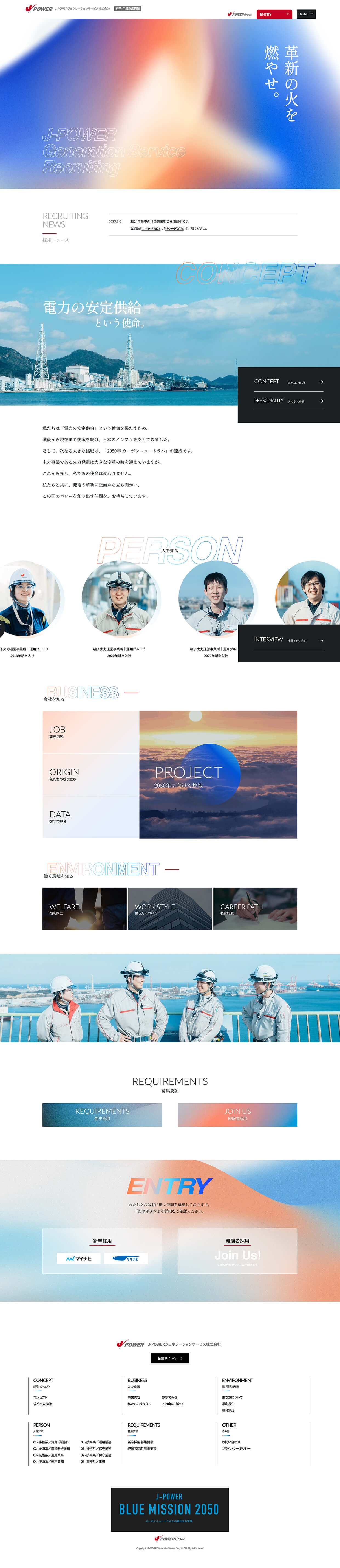 リクルートサイトは抽象的な揺らめくグラデーションをキービジュアルに用いることで、コアビジネスである火力発電と未来への明るい展望=夜明けを表現。爽やかさと先進性を併せ持ったデザイントーンを軸に、2050年カーボンニュートラル達成への取り組みや、時代に即した働き方など、ハード/ソフトの両面における将来性の豊かさを求職者に訴求しています。