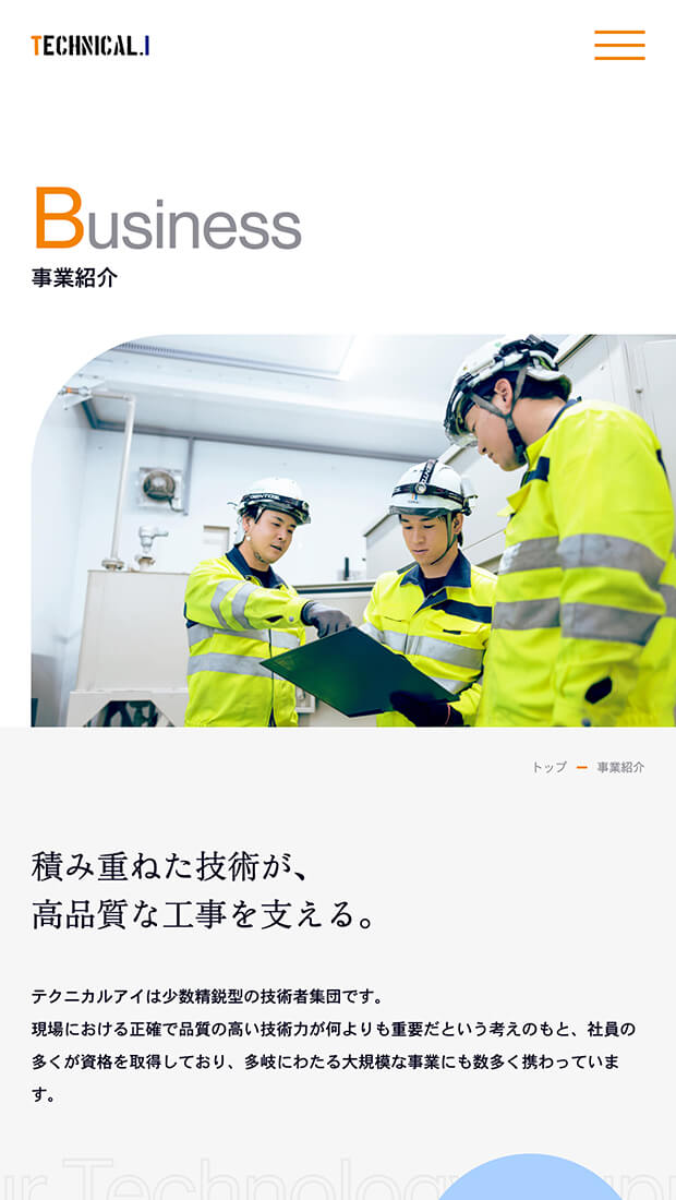 正確で品質の高い技術力が何よりも重要だという考えのもと、多岐にわたる大規模な事業にも数多く携わっておられるテクニカルアイ様の誠実な姿勢をサイトデザインの世界観にもしっかりと反映しました。