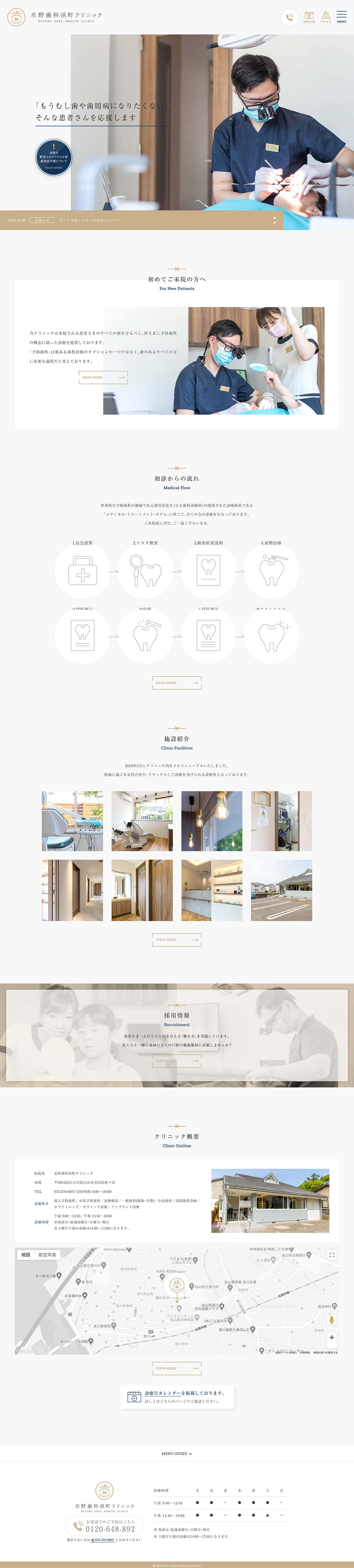 白山市美川にある「水野歯科浜町クリニック」様。事業継承に伴うクリニック名の変更や建物のリノベーションとあわせ、ロゴデザインやサイトリニューアルなど全面的なリブランディングをお手伝いさせていただきました。「虫歯にならない口内環境を作る予防歯科」が特徴であることから、ロゴマークでは「虫歯を止めて、歯を守る」ことを表現、またメインターゲットである女性に強く訴求するため、落ち着きと上品さのあるブランドデザインを心がけました。