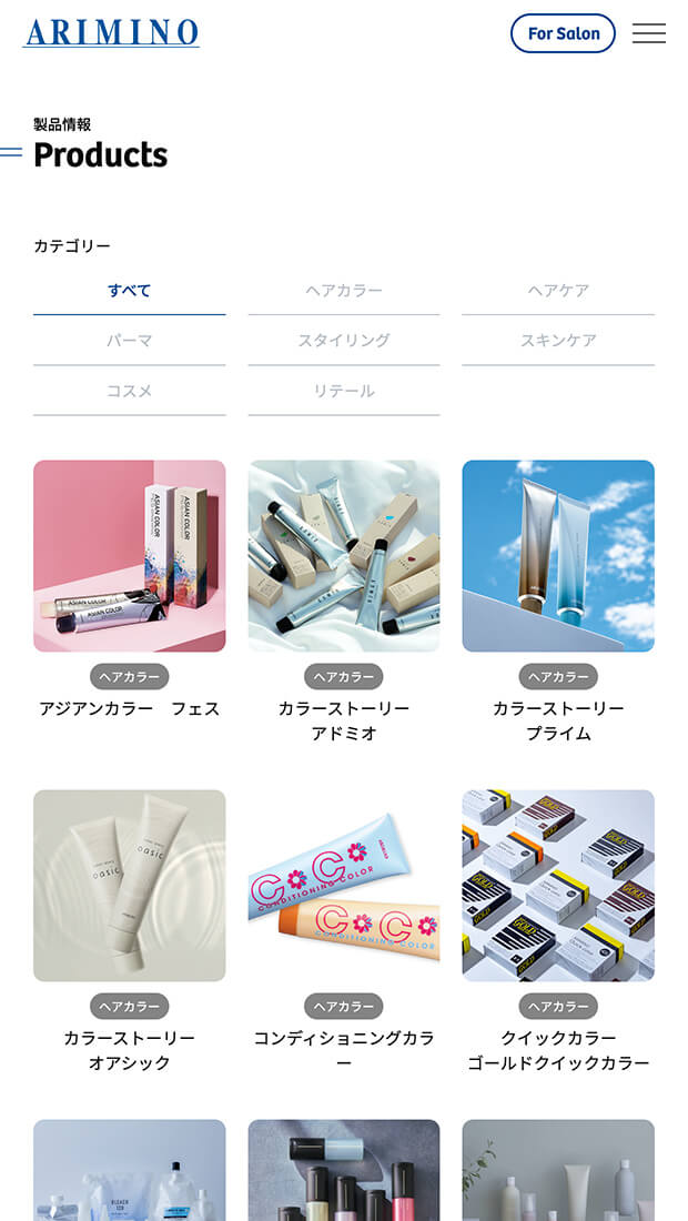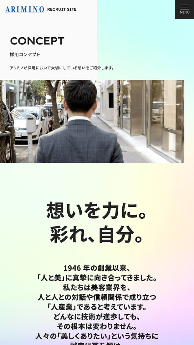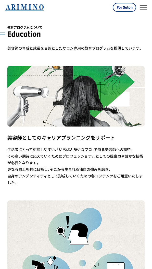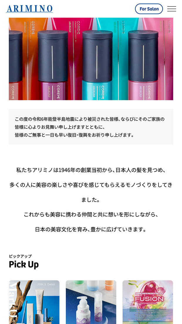 頭髪および肌用化粧品の老舗メーカーとして、これまで数多くのサロン専売プロダクトを世に送り出してきた株式会社アリミノ様。この度はコーポレートサイト、採用サイト制作のお手伝いをさせていただきました。