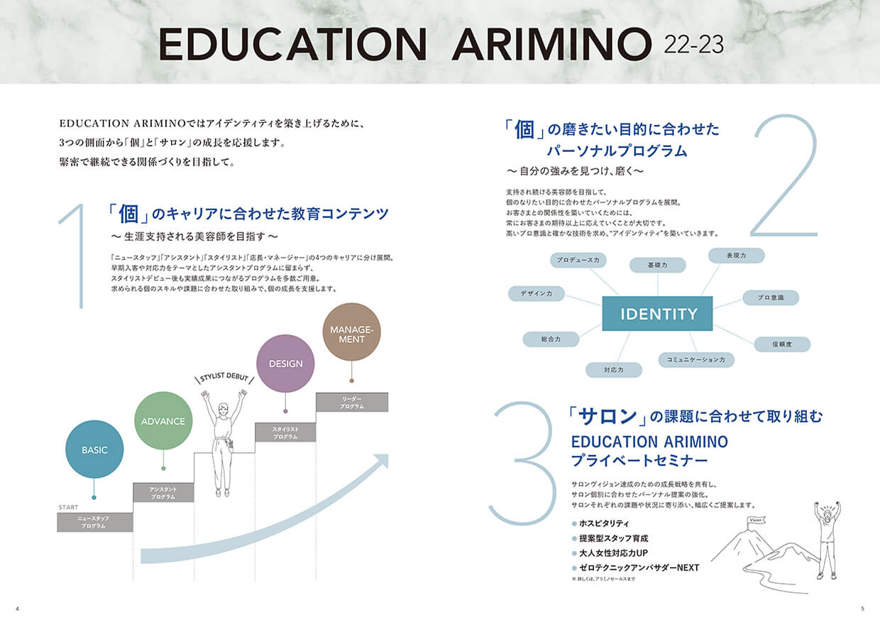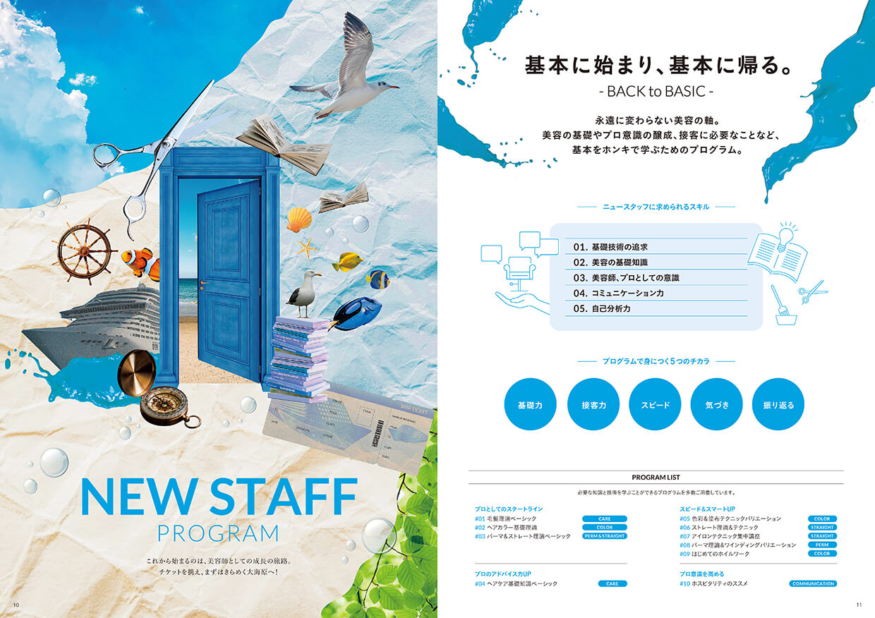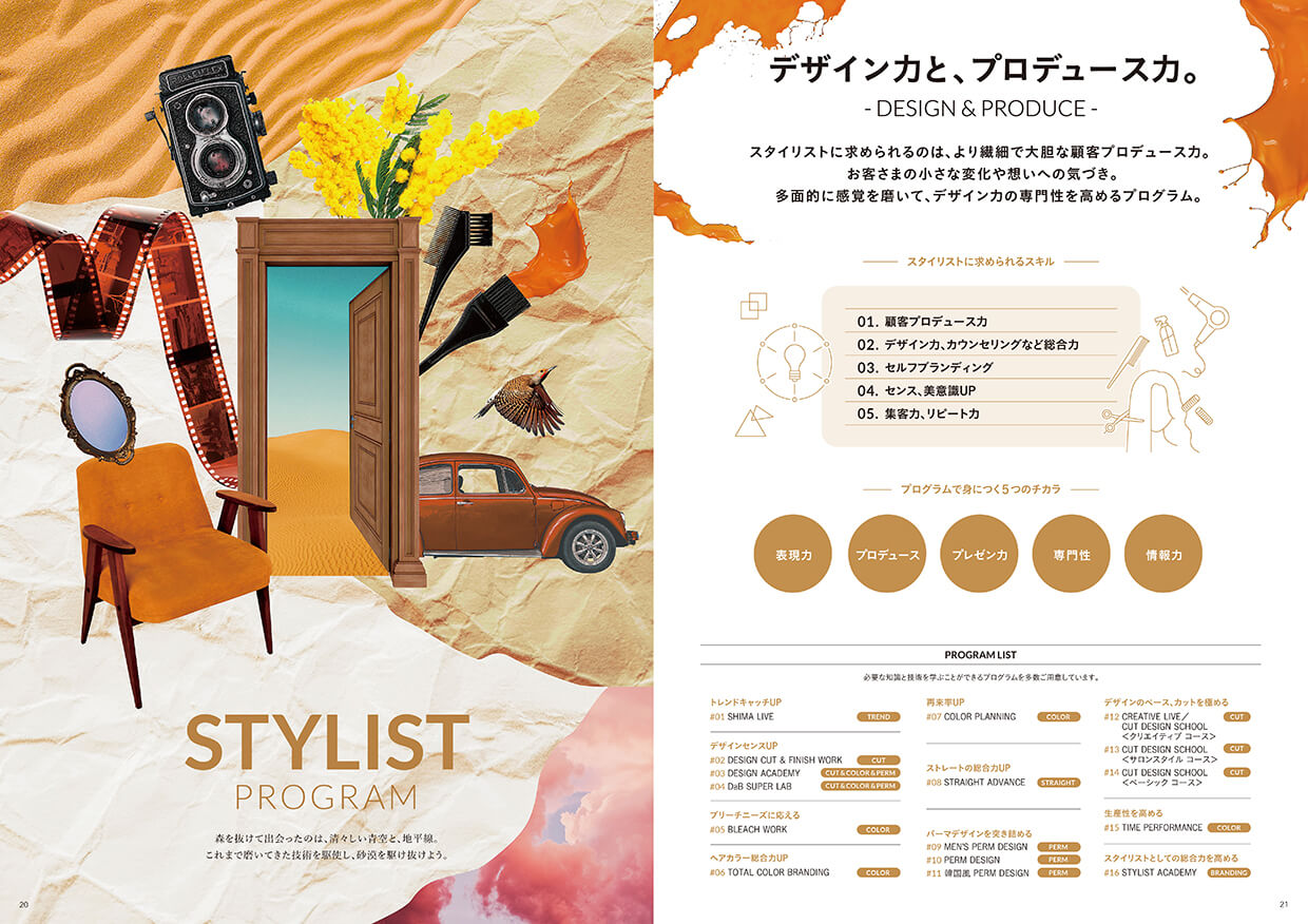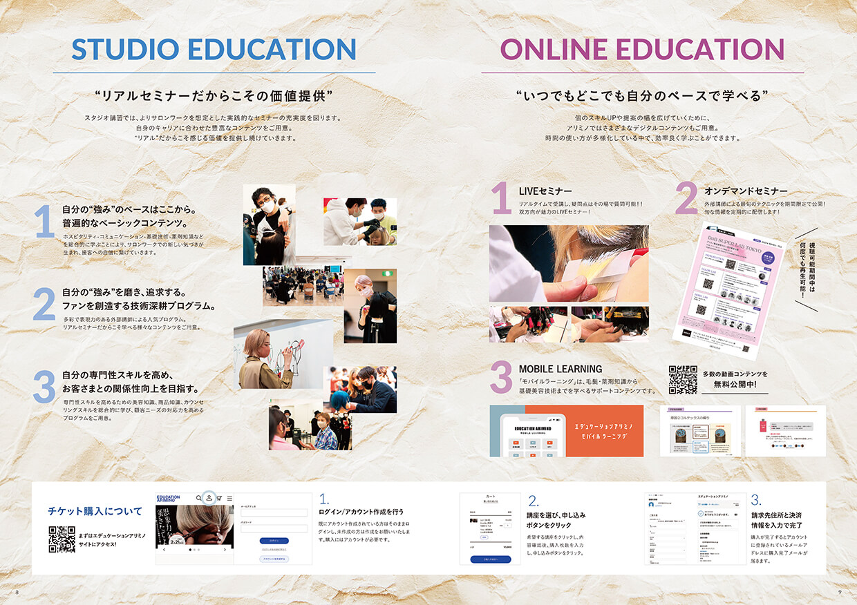 前年に引き続き、サロン様に向けて展開するキャリアプランニングのコンテンツを取りまとめた冊子「EDUCATION BOOK」の制作をお手伝いをさせていただきました。 本誌は年間を通してサロン様のお手元に残り、アシスタントやスタイリスト、そしてリーダー層まで、幅広いサロン関係者の方々が各種プログラムにご参加いただく手引きとなる冊子です。本年は学びの過程を旅に準えてビジュアルコンセプトを立ち上げ、表紙と各教育コンテンツの世界観を展開しました。