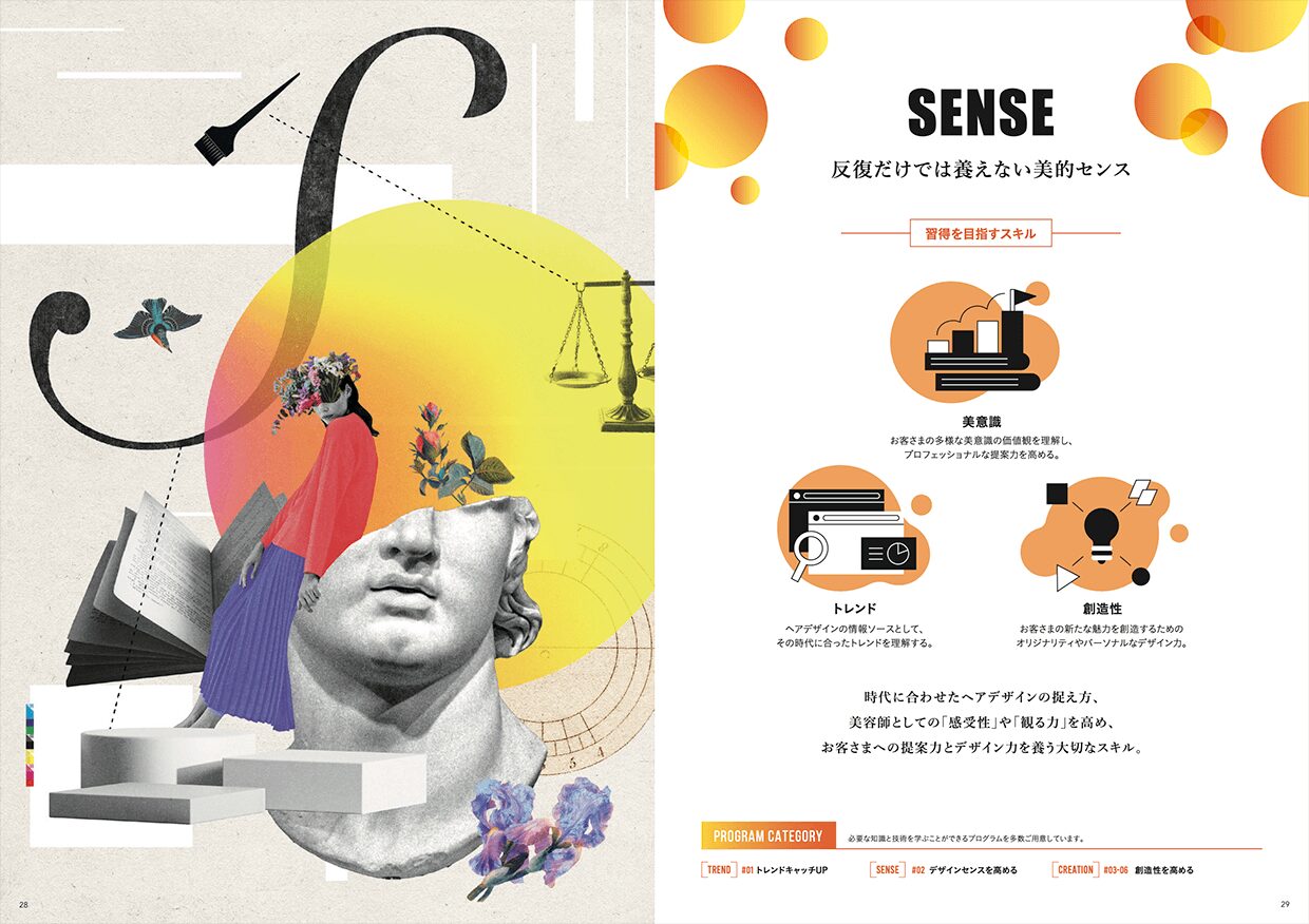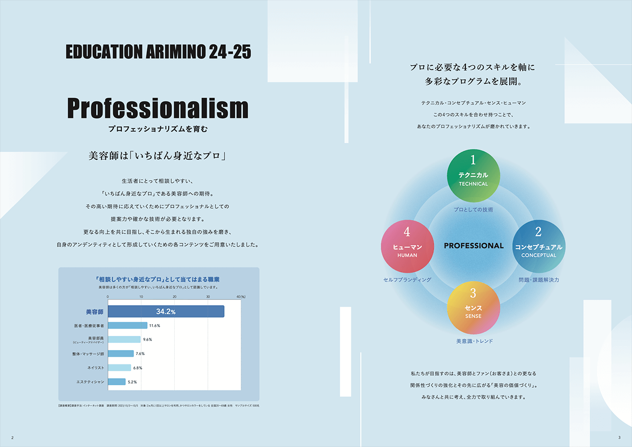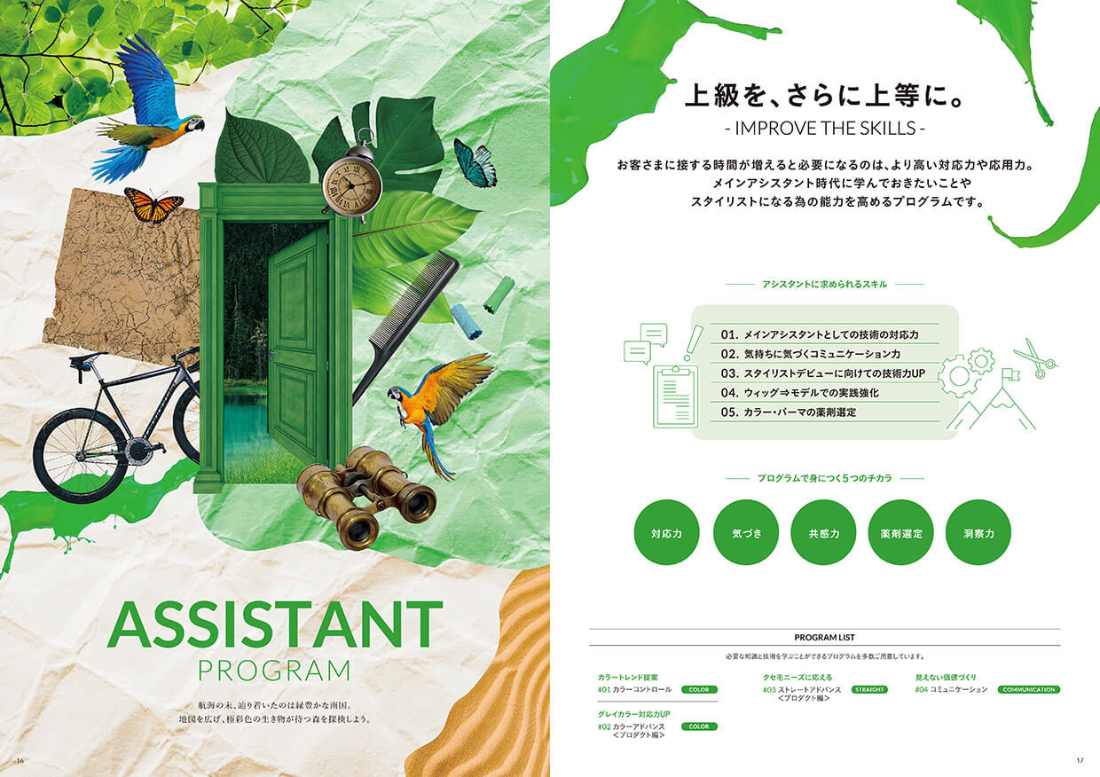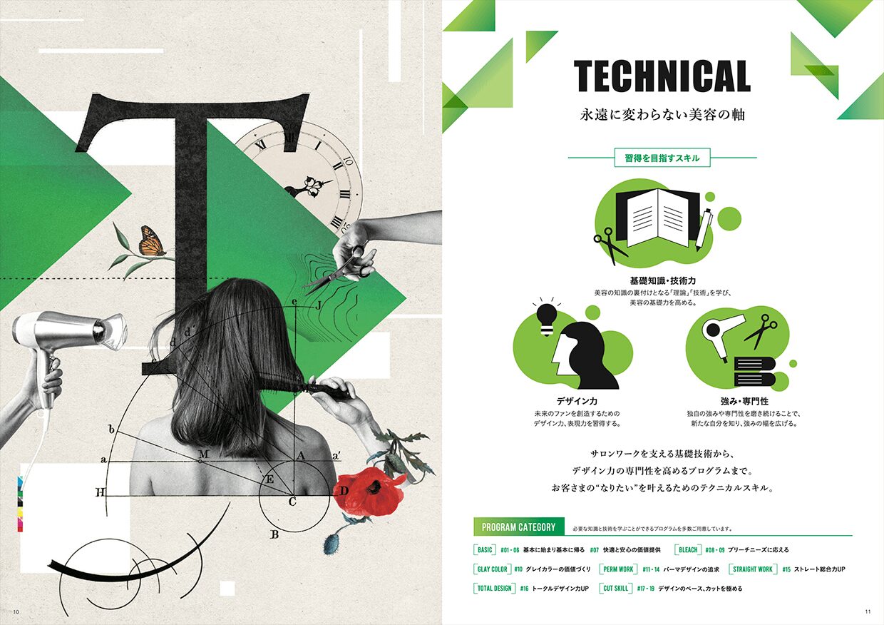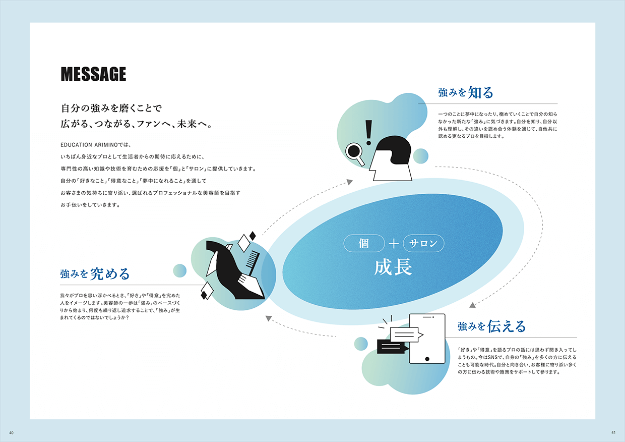 前年に引き続き、サロン様に向けて展開するキャリアプランニングのコンテンツを取りまとめた冊子「EDUCATION BOOK」の制作をお手伝いをさせていただきました。 本誌は年間を通してサロン様のお手元に残り、アシスタントやスタイリスト、そしてリーダー層まで、幅広いサロン関係者の方々が各種プログラムにご参加いただく手引きとなる冊子です。本年は学びの過程を旅に準えてビジュアルコンセプトを立ち上げ、表紙と各教育コンテンツの世界観を展開しました。