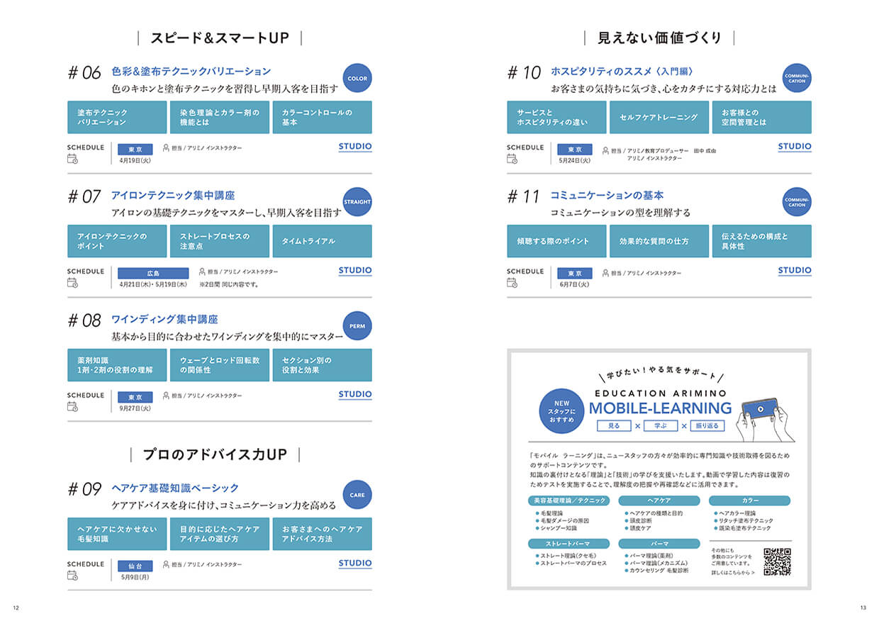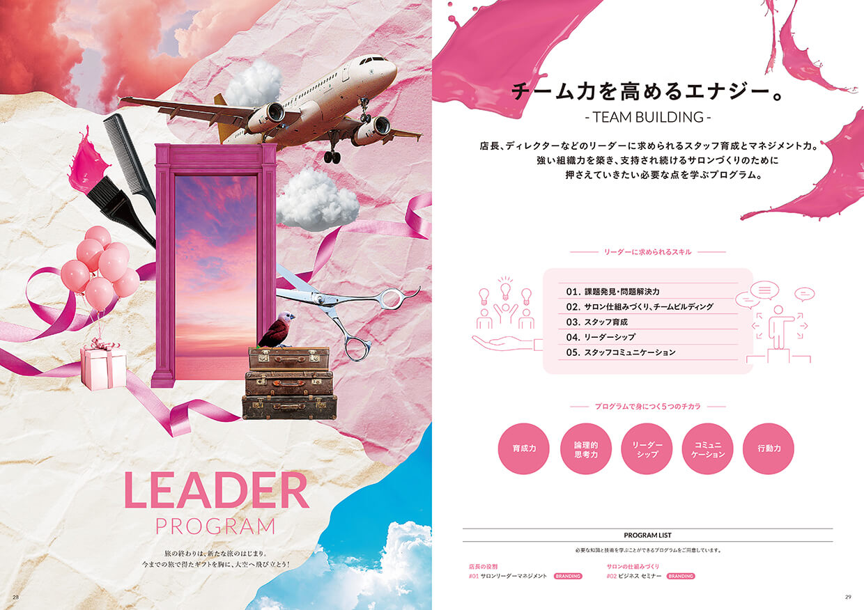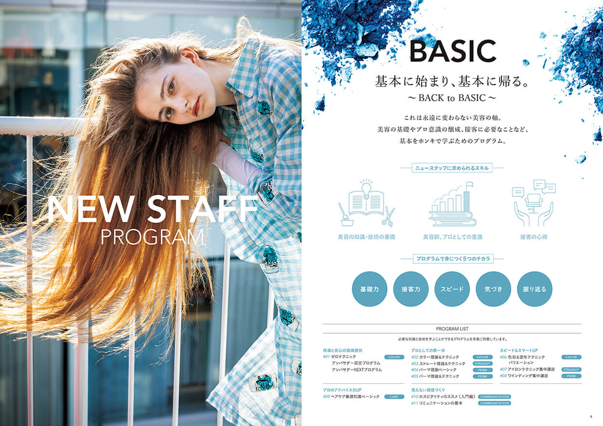 今回は、サロン様に向けて展開するキャリアプランニングのコンテンツを取りまとめた冊子「EDUCATION BOOK」の制作をお手伝いをさせていただきました。 本誌は年間を通してサロン様のお手元に残り、アシスタントやスタイリスト、そしてリーダー層まで、幅広いサロン関係者の方々が各種プログラムにご参加いただく手引きとなる冊子です。フレンドリーに有益な情報を得られるよう、ユーザビリティに考慮したビジュアルとコンテンツを展開しました。