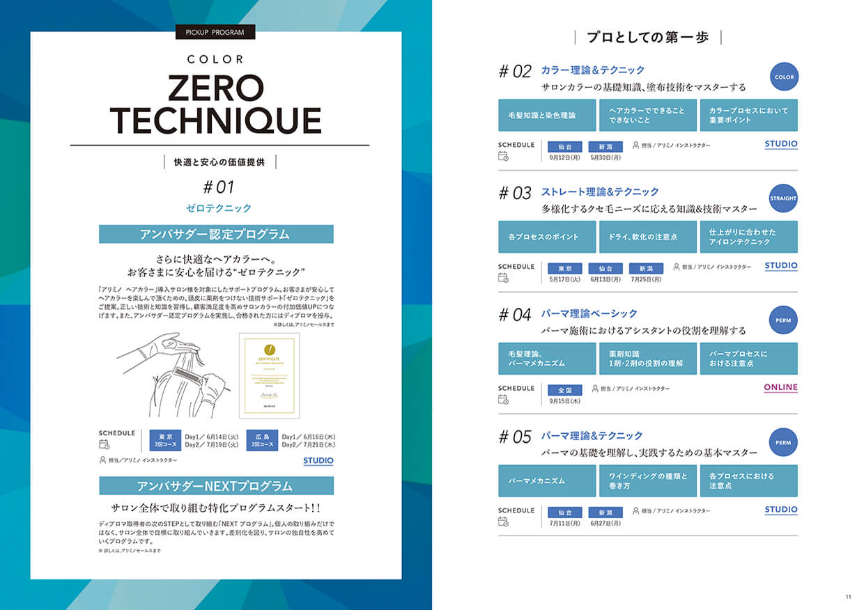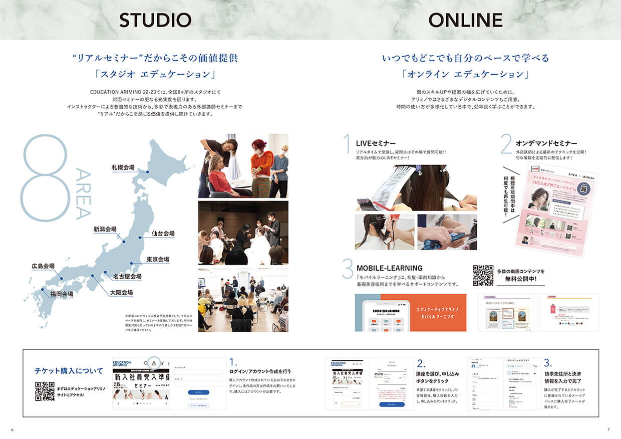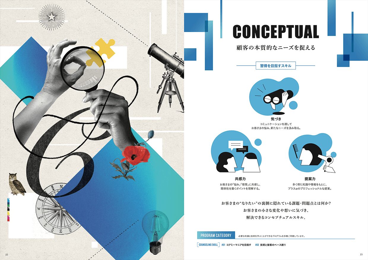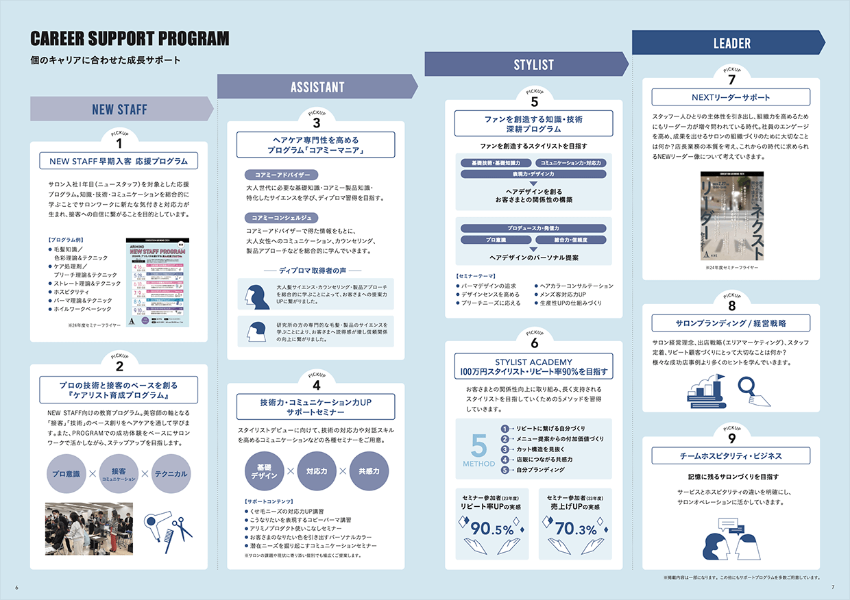 今回は、サロン様に向けて展開するキャリアプランニングのコンテンツを取りまとめた冊子「EDUCATION BOOK」の制作をお手伝いをさせていただきました。 本誌は年間を通してサロン様のお手元に残り、アシスタントやスタイリスト、そしてリーダー層まで、幅広いサロン関係者の方々が各種プログラムにご参加いただく手引きとなる冊子です。フレンドリーに有益な情報を得られるよう、ユーザビリティに考慮したビジュアルとコンテンツを展開しました。