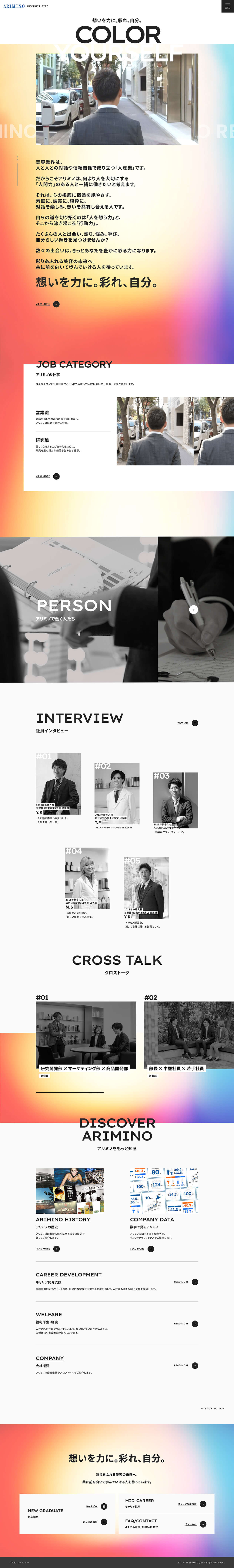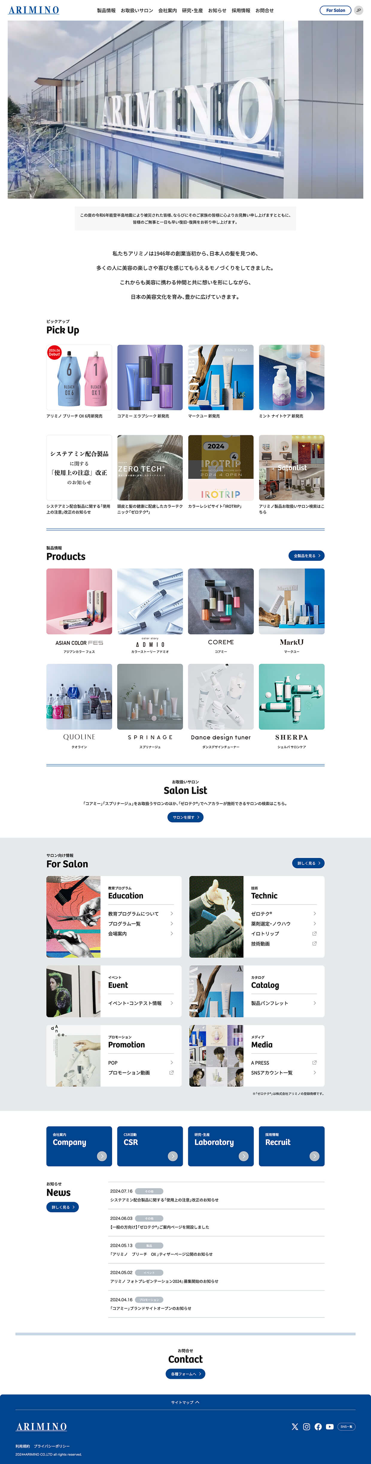 頭髪および肌用化粧品の老舗メーカーとして、これまで数多くのサロン専売プロダクトを世に送り出してきた株式会社アリミノ様。この度はコーポレートサイト、採用サイト制作のお手伝いをさせていただきました。