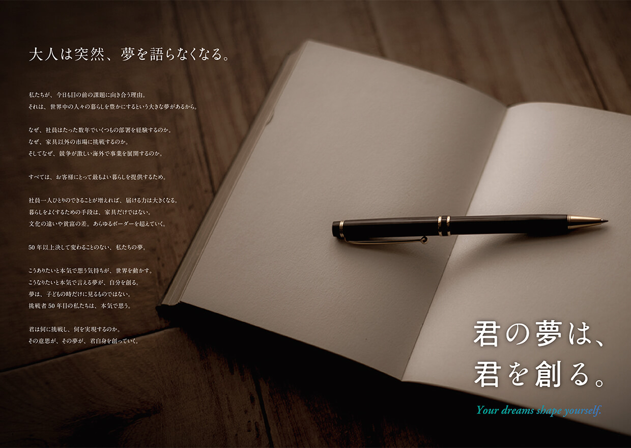 「暮らしをつくり、世界をつなぐ」のメインコンセプトのもと、家具の製造・販売だけにとどまらない未来への展望や世界観を伝えるとともに、「一人ひとりの未来への挑戦、その気持ちが世界を変える原動力になる」というメッセージを込め、学生の挑戦心へ訴求するコンテンツへと落とし込みました。