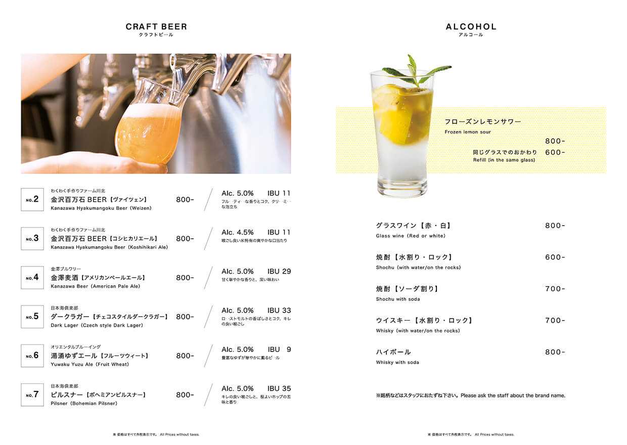 ロゴは金沢市の市章である梅鉢紋と、ビールの泡のイメージを重ね合わせ、女性にも愛されるようデザイン。OPENと同時に販売開始された「金澤東山ビール」のパッケージには、店舗の扉をモチーフとして取り入れました。金澤らしい金の箔押し加工と瓶の首にかけたタグが新鮮で、お土産として県内外のお客様にご好評いただいています。