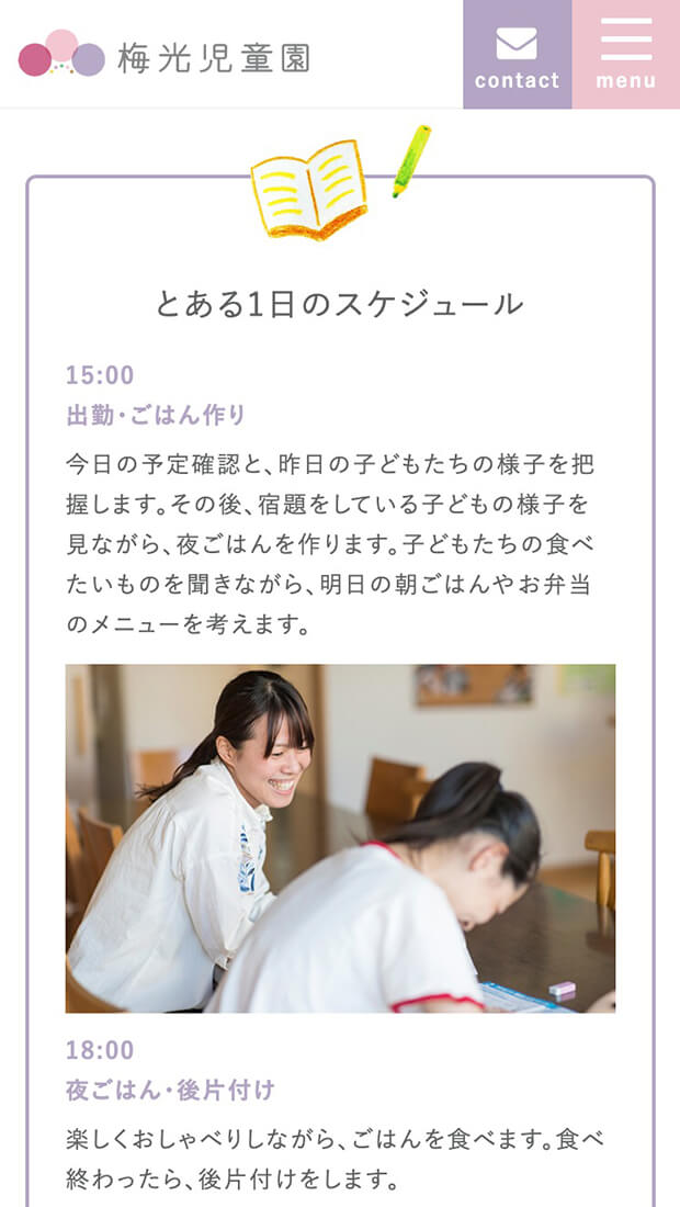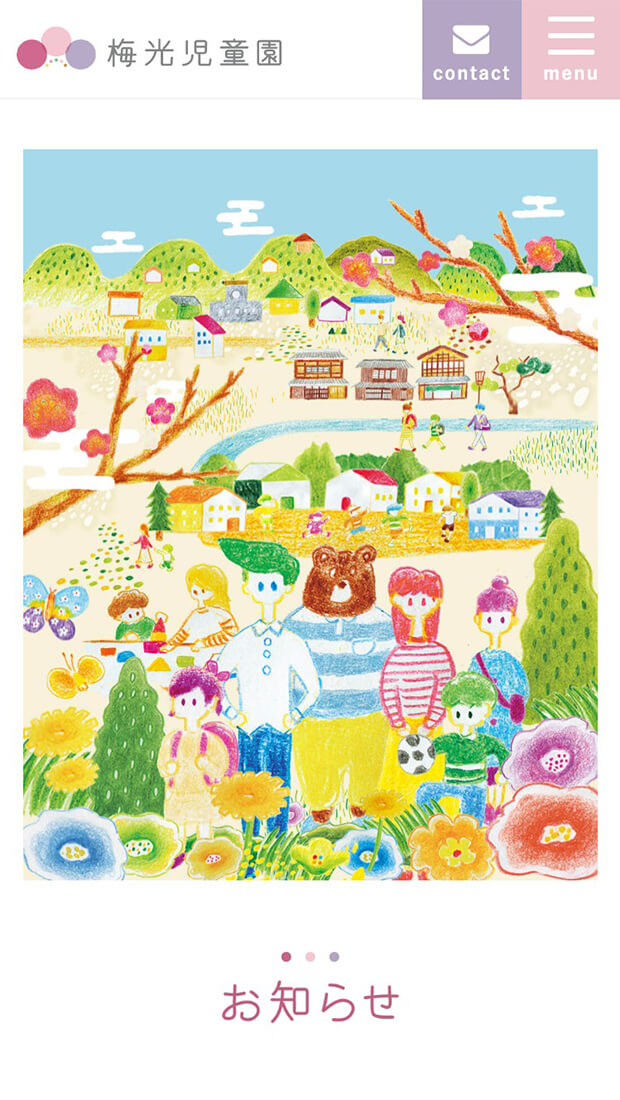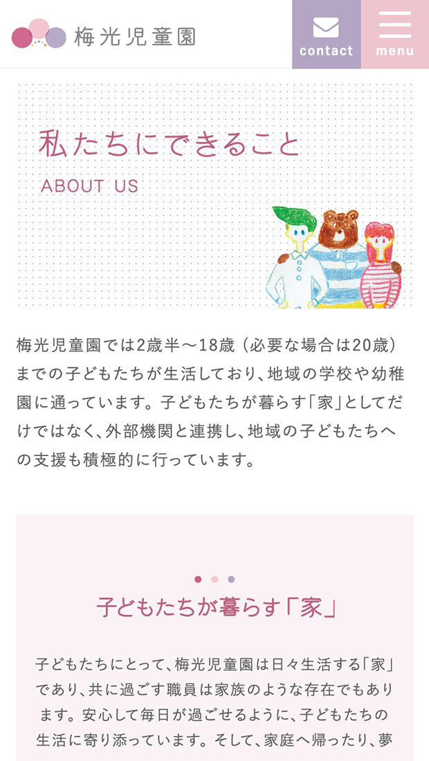 設立から110年以上もの歴史を持つ児童養護施設「梅光児童園」様。新規コーポレートサイトの制作に先立ち、まずはロゴデザインからご提案させていただきました。梅の花をモチーフにしたロゴマーク、3つの大きな円は「職員」と「地域社会」が「子どもたち」を支えている様子を表し、5つの小さなカラフルな点は昭和29年当時の小舎名から取りました。この大小の円と点により、過去も未来も梅光児童園様が中心となって地域社会の中心を担っていく気持ちを表現しています。コーポレートサイトでは、福井のイラストレーター「ヒキノユウジ」さんのイラストを全面に施し、ありのままの温かみが伝わるデザインとしました。子どもを取り巻く環境やライフスタイルが激変していく昨今、梅光児童園様のような新しい児童養護施設の役割が非常に大きくなってきていると感じます。