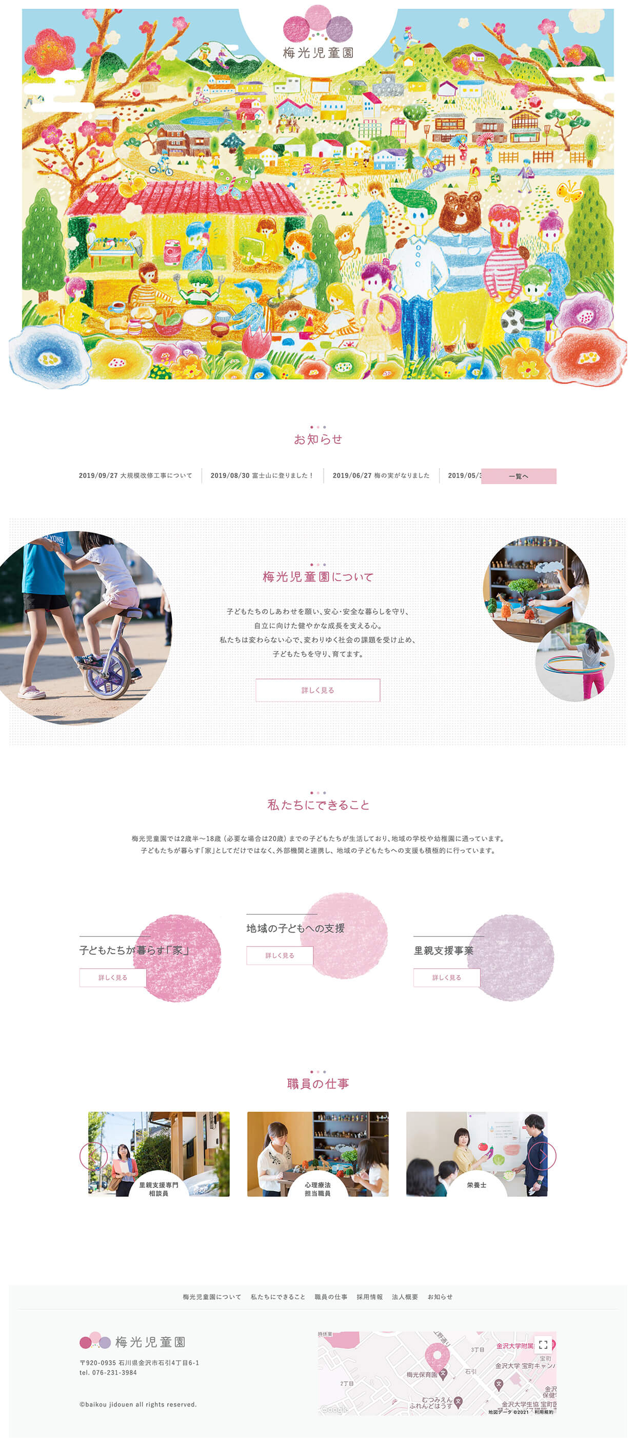 設立から110年以上もの歴史を持つ児童養護施設「梅光児童園」様。新規コーポレートサイトの制作に先立ち、まずはロゴデザインからご提案させていただきました。梅の花をモチーフにしたロゴマーク、3つの大きな円は「職員」と「地域社会」が「子どもたち」を支えている様子を表し、5つの小さなカラフルな点は昭和29年当時の小舎名から取りました。この大小の円と点により、過去も未来も梅光児童園様が中心となって地域社会の中心を担っていく気持ちを表現しています。コーポレートサイトでは、福井のイラストレーター「ヒキノユウジ」さんのイラストを全面に施し、ありのままの温かみが伝わるデザインとしました。子どもを取り巻く環境やライフスタイルが激変していく昨今、梅光児童園様のような新しい児童養護施設の役割が非常に大きくなってきていると感じます。