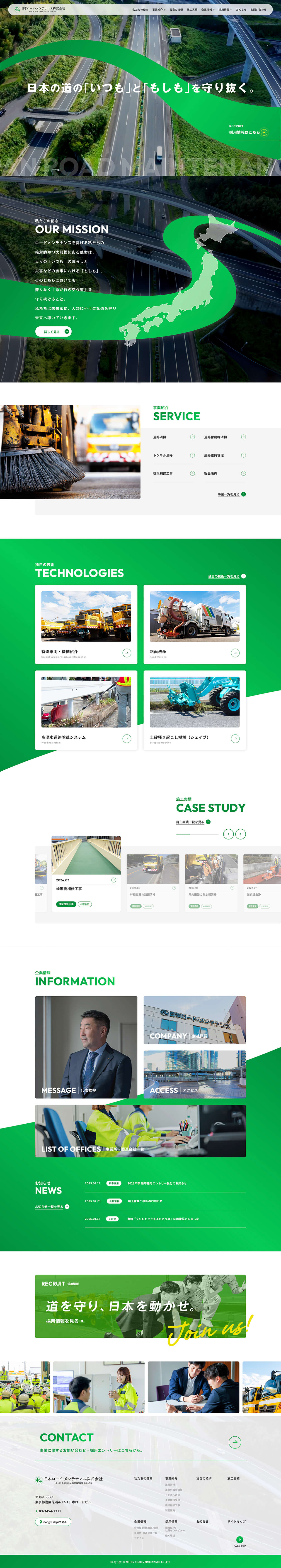 一般道路・高速道路の清掃や維持管理を業務領域とされる日本ロード・メンテナンス株式会社様。企業ブランディングとしてMVVを策定、その後のコーポレートサイト制作まで一貫してサポートさせていただきました。日本ロード・メンテナンス様が大切にされている価値観や思いを『日本の道の「いつも」と「もしも」を守り抜く』というコピーで表現し、サイト全体のデザインにもしっかりと世界観として反映しました。