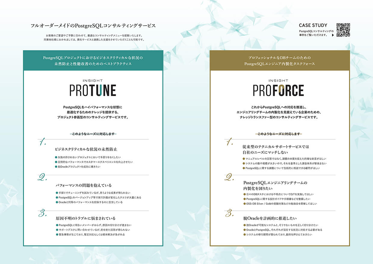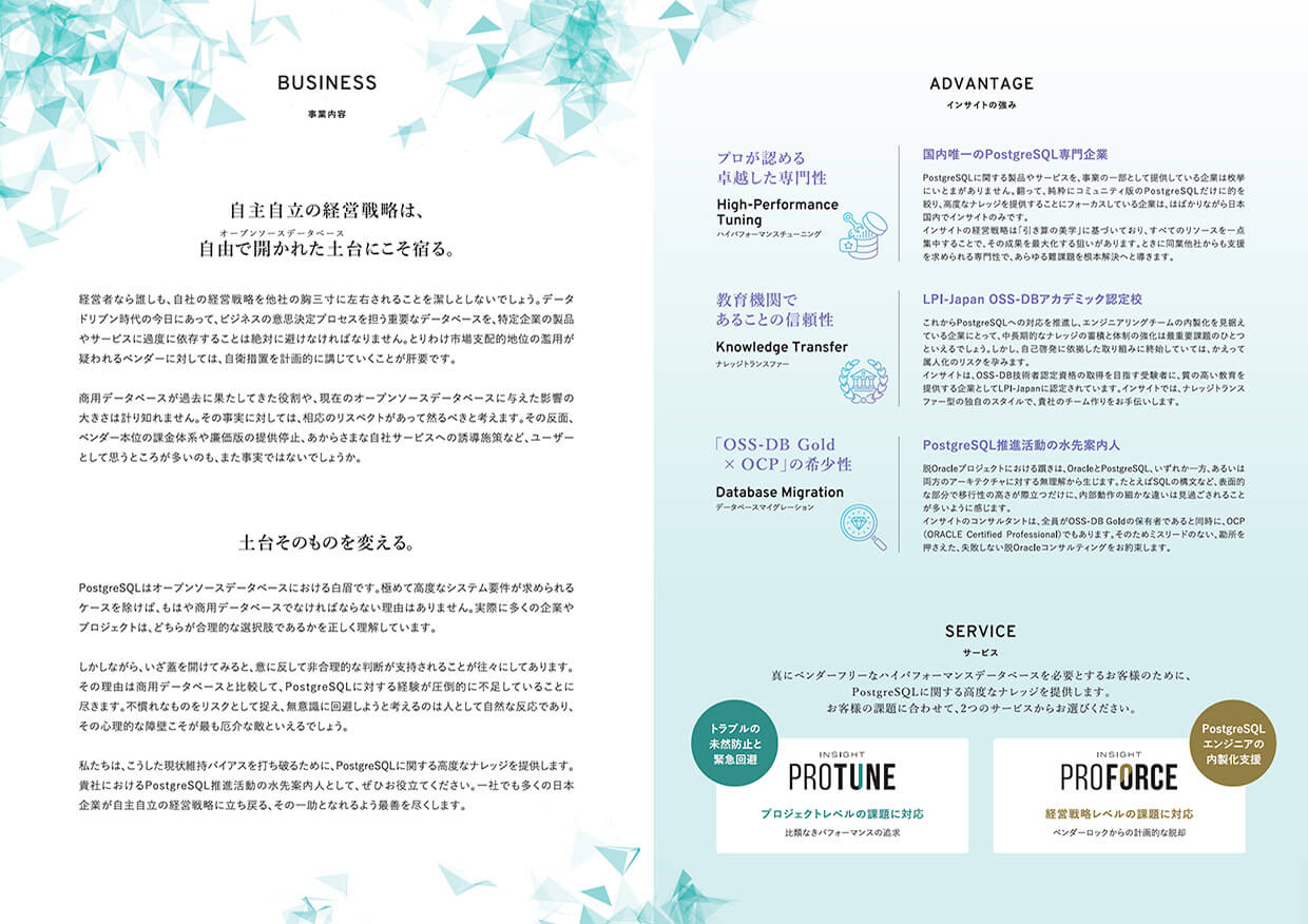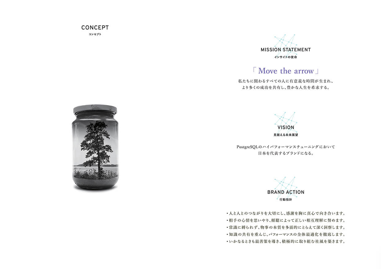 株式会社インサイト様は、国内唯一である「PostgreSQLのハイパフォーマンスチューニング」サービスを展開する企業です。コーポレートブランディングおよび事業ブランディングの構築をサポートさせていただいております。