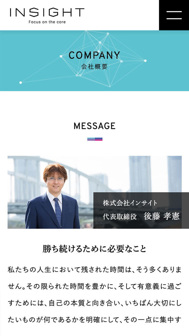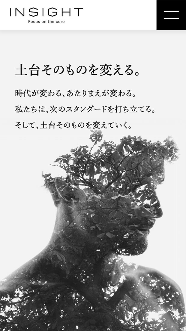 無形のブランドやサービスだからこそ、その価値を的確に伝えることが課題でした。そこで、無駄を省き、ストレートなメッセージをダイレクトに伝える世界観を構築。知的でインテリジェントな印象を持たせつつ、コンセプチュアルなビジュアルを通じて、インサイト様の理念や思想を表現しました。