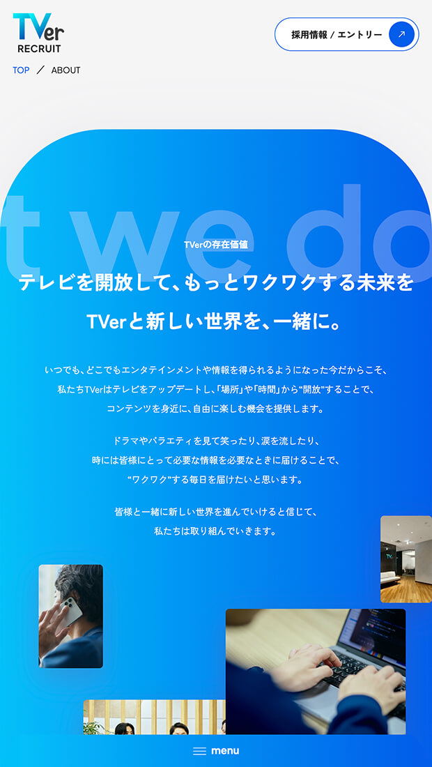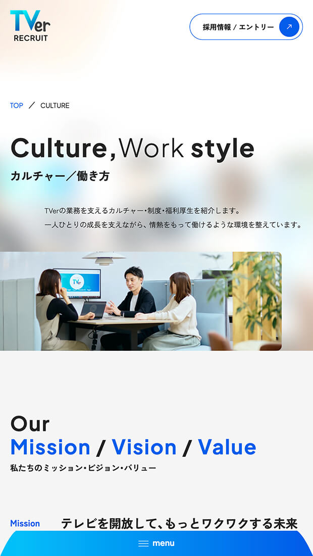国内最大級の見逃し無料配信動画サービスでありドラマ、バラエティ、アニメ、報道・ドキュメンタリー、スポーツなど人気番組を毎週650番組以上見放題のTVer(ティーバー)を運営する株式会社TVer様。この度、さらなる事業拡大を見据えた採用強化のために採用サイト構築をお手伝いさせていただきました。