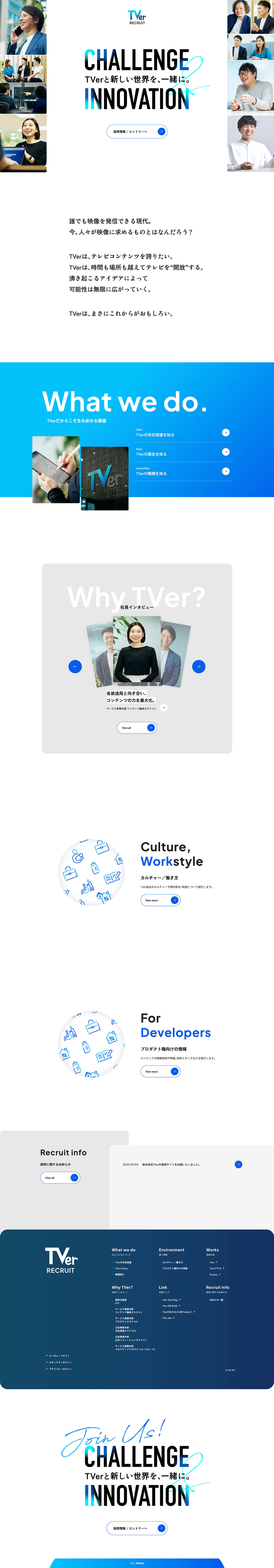 国内最大級の見逃し無料配信動画サービスでありドラマ、バラエティ、アニメ、報道・ドキュメンタリー、スポーツなど人気番組を毎週650番組以上見放題のTVer(ティーバー)を運営する株式会社TVer様。この度、さらなる事業拡大を見据えた採用強化のために採用サイト構築をお手伝いさせていただきました。