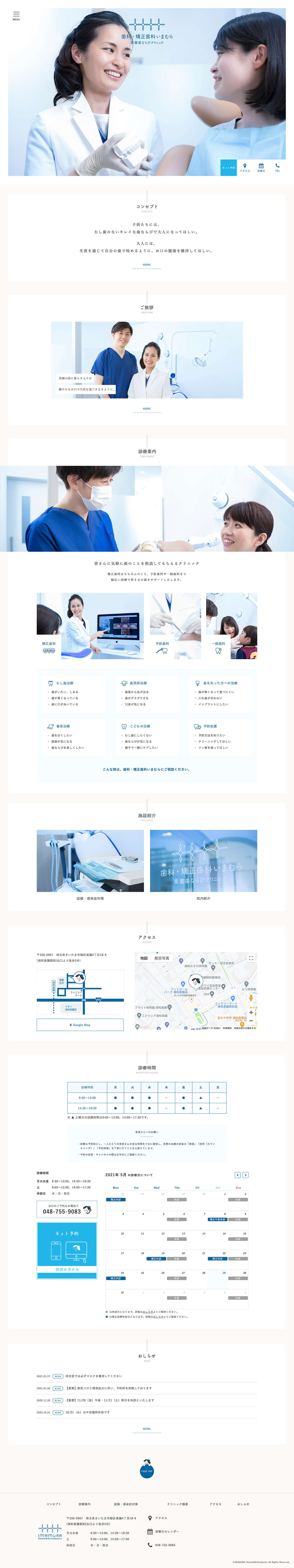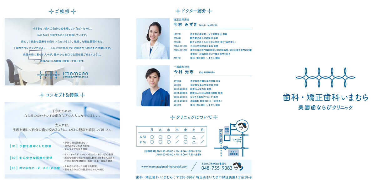 埼玉県浦和美園でH29年5月15日に子どもの矯正治療と予防をメインに新規開業された「歯科・矯正歯科いまむら-美園歯ならびクリニック」様。ご夫婦共に歯科医師で美男美女でありながら、これまでの実績・実力が充分で、かつ、優しい心とご対応で流行るクリニック間違いなしです。開業半年前に、弊社「SHITSURAI」サイトからお問い合わせいただき、そこから開業に向けて、ロゴやWEB等の計画を進めていきました。キーカラーでもある今村ブルーを軸として、撮影でも全体のトーンを意識しながら、清潔感と安心感が与えられるようなテンションとしております。これからのますますの発展が楽しみです!