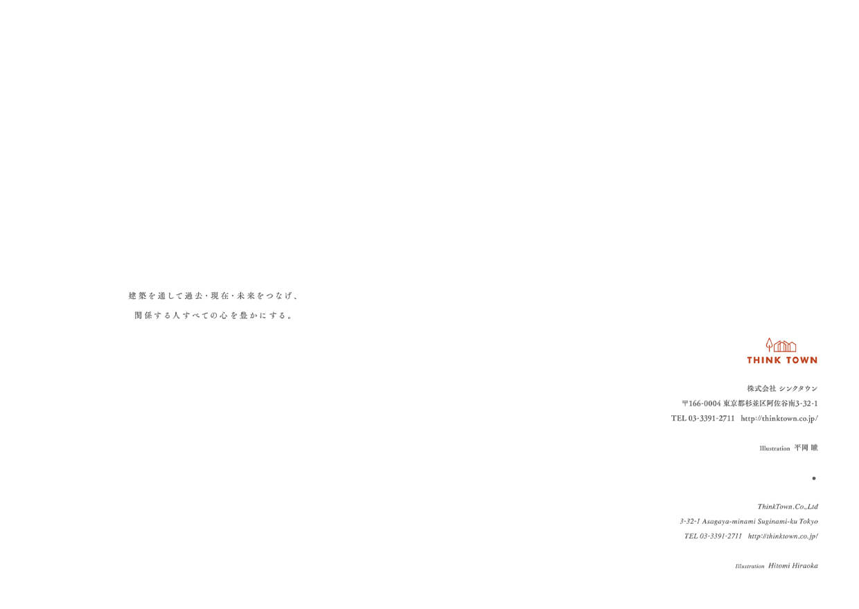 東京都阿佐ヶ谷で住宅・店舗の「デザイン+設計+建築」をワンストップでお応えする「THINK TOWN(シンクタウン」様。新築住宅・リノベーション・店舗デザインの各企画/設計/デザインを行なっており、本当に良いものを届けたいという強い想いが建物に現れています。『人が人らしく暮らす、ということ』をコンセプトとして、当たり前な普遍性を大切に、人間本来のあるべき姿と成長を考えた家づくりで、街全体をも意識した信頼のおける素敵な会社です。また、コンセプトブックは、版画家の平岡瞳さんともコラボし、版画絵と詩でシンクタウンが考える世界観を表現しております。