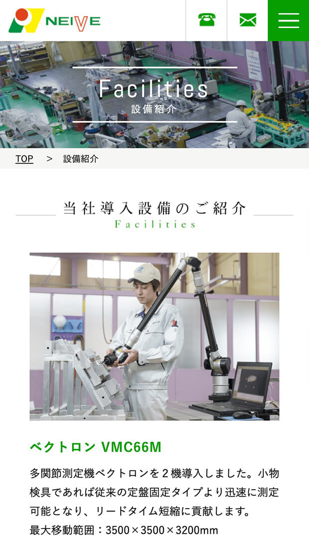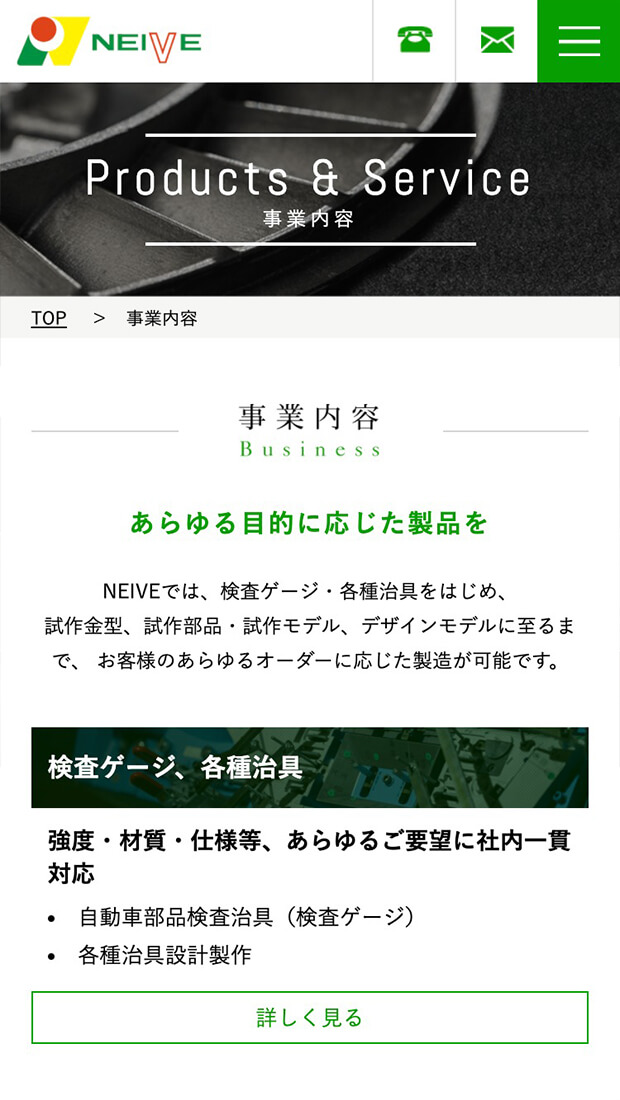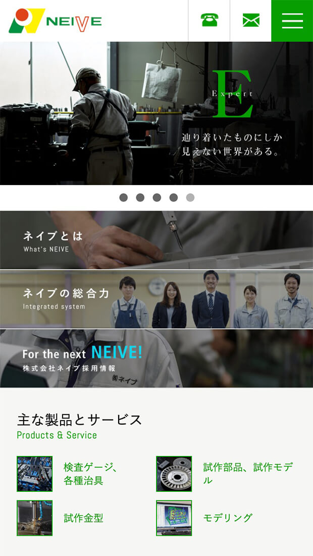 自動車をはじめ様々な工業製品向けの検査ゲージや治具等の専門メーカー、株式会社ネイブ様。コーポレートサイトのリニューアルと会社案内パンフレットを制作させていただきました。NEIVEの頭文字に応じた5つのブランドビジュアルでは、写真とキャッチコピーで、ネイブ様の高い専門性と技術力を訴求。また、優秀な新卒者にもきちんとアピールできるよう、コーポレートカラーでもあるグリーンを基調としたスッキリとしたデザインとさせていただきました。ネイブ様の素晴らしい技術力が、これからも日本のものづくりに寄与されることに期待しています。