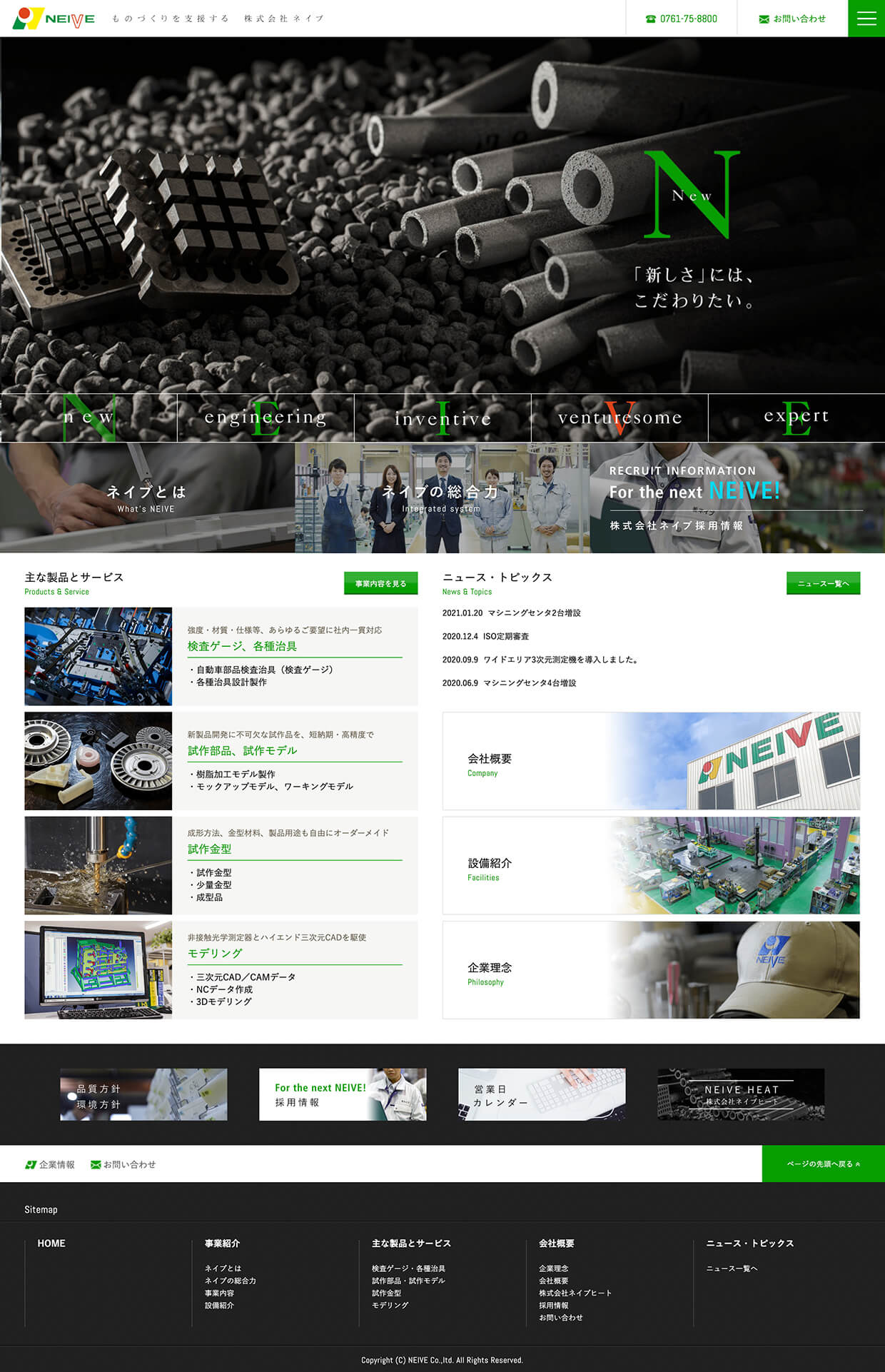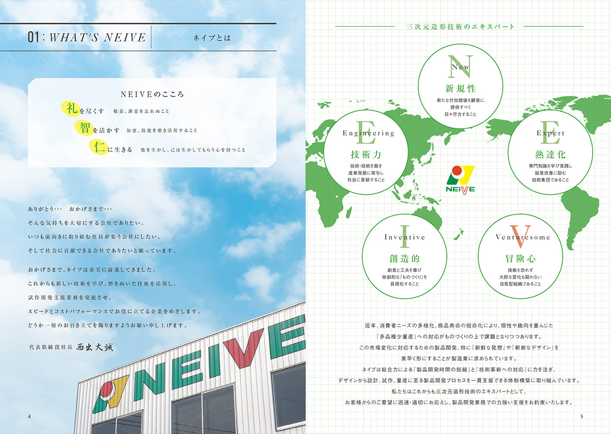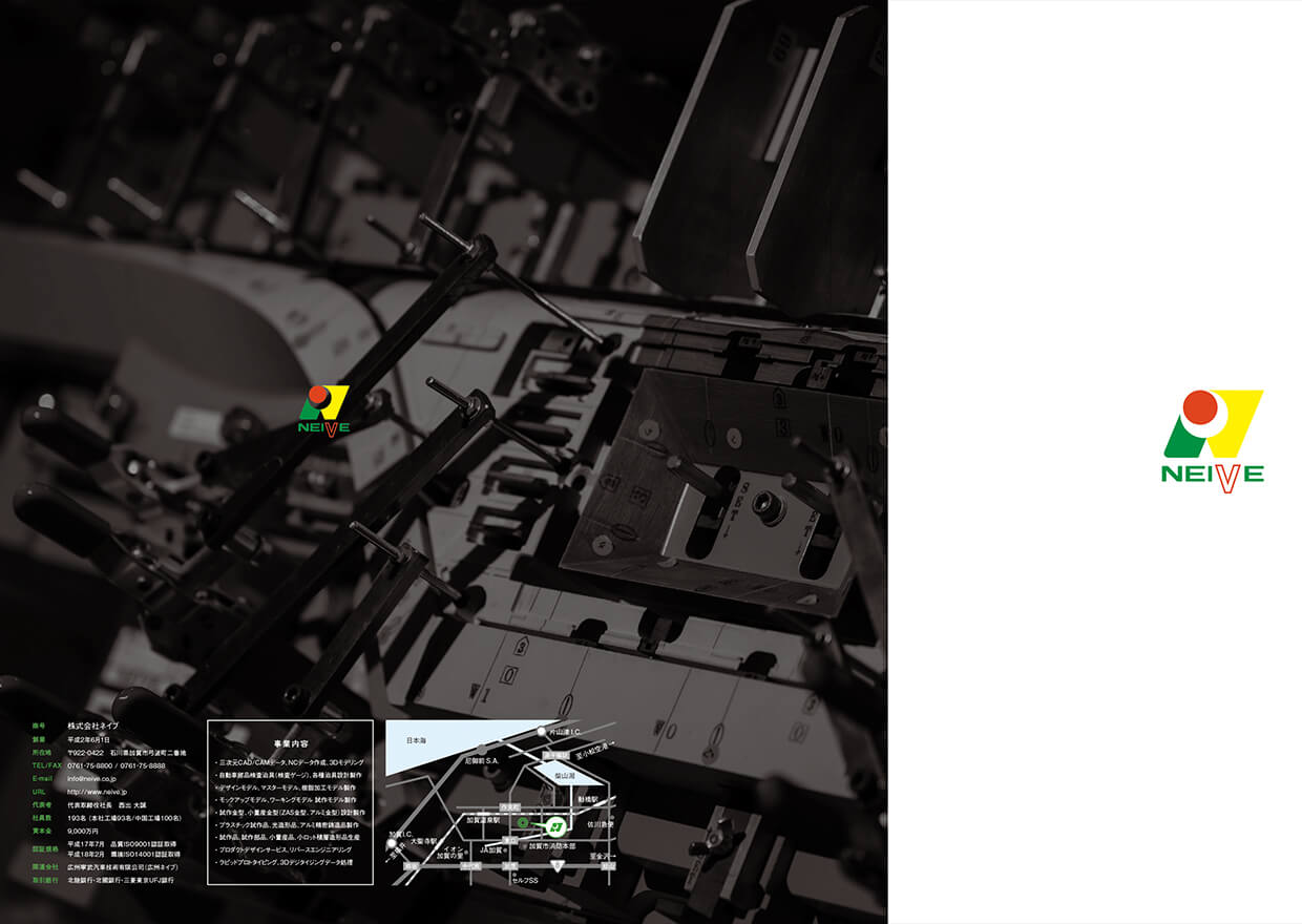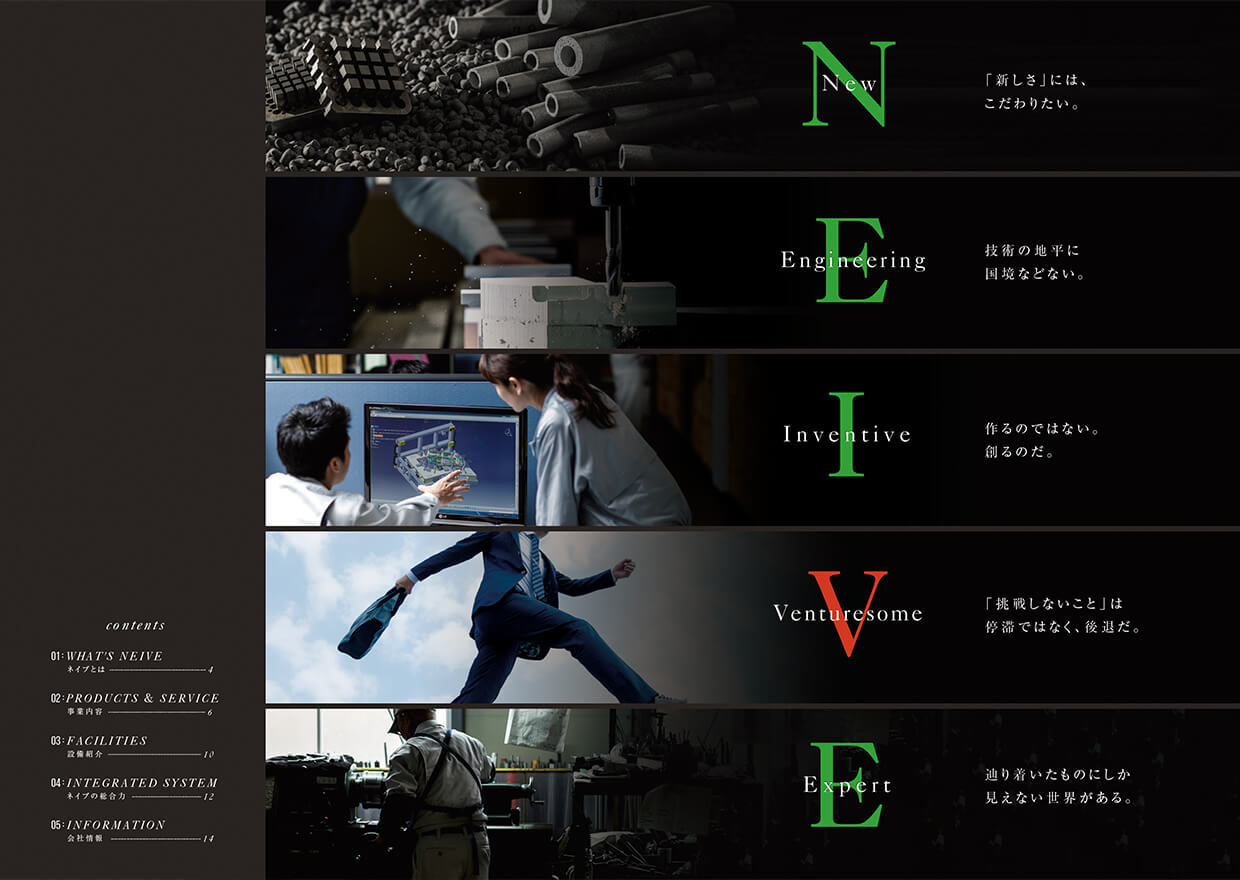 自動車をはじめ様々な工業製品向けの検査ゲージや治具等の専門メーカー、株式会社ネイブ様。コーポレートサイトのリニューアルと会社案内パンフレットを制作させていただきました。NEIVEの頭文字に応じた5つのブランドビジュアルでは、写真とキャッチコピーで、ネイブ様の高い専門性と技術力を訴求。また、優秀な新卒者にもきちんとアピールできるよう、コーポレートカラーでもあるグリーンを基調としたスッキリとしたデザインとさせていただきました。ネイブ様の素晴らしい技術力が、これからも日本のものづくりに寄与されることに期待しています。