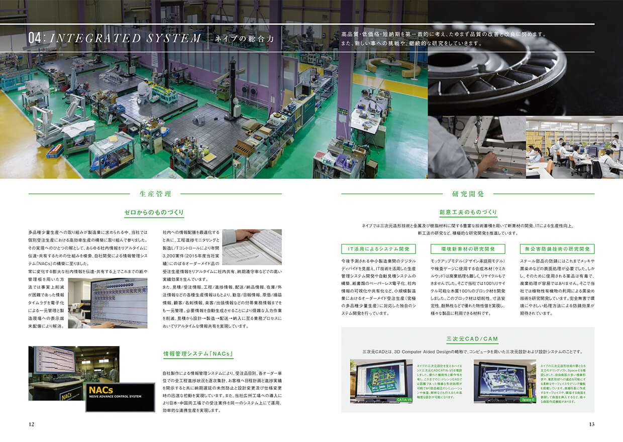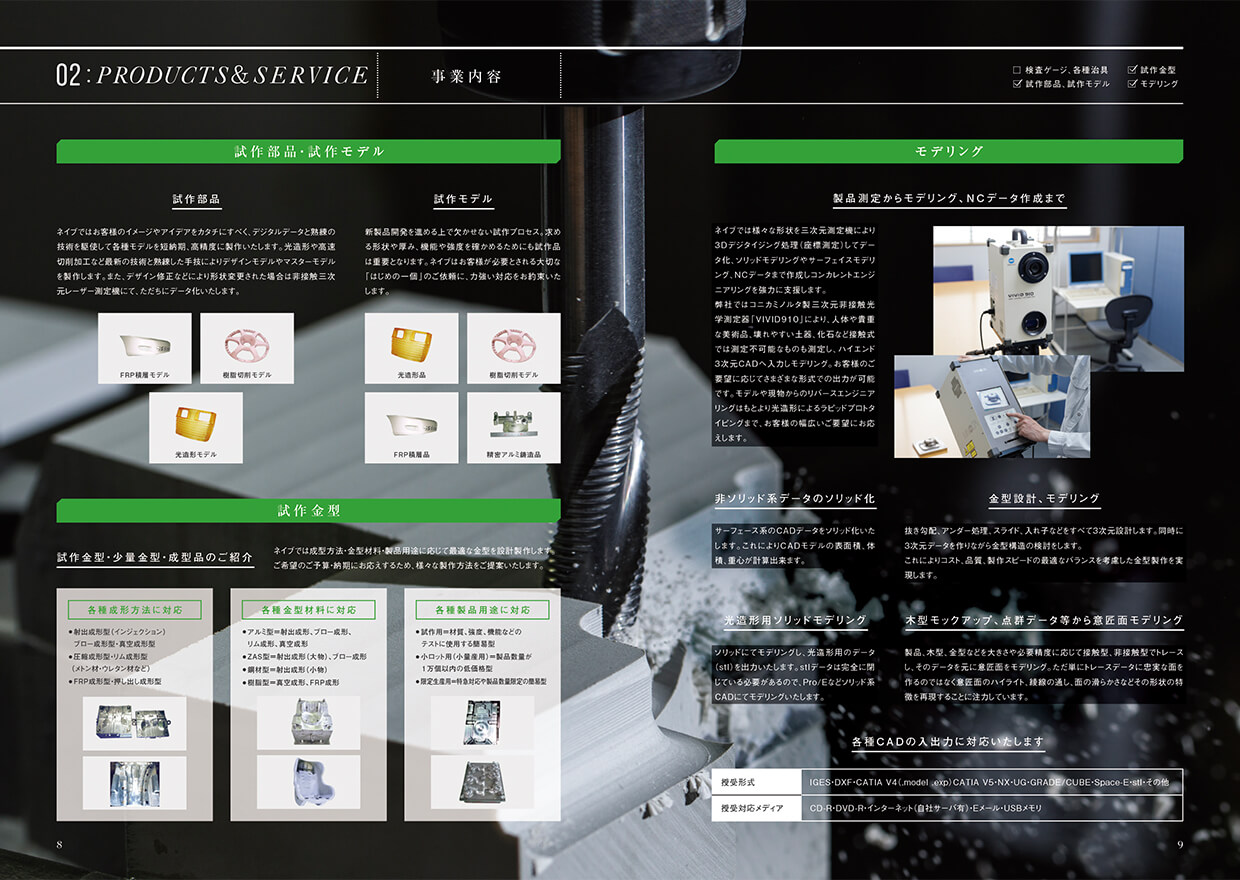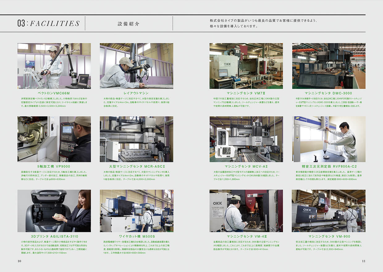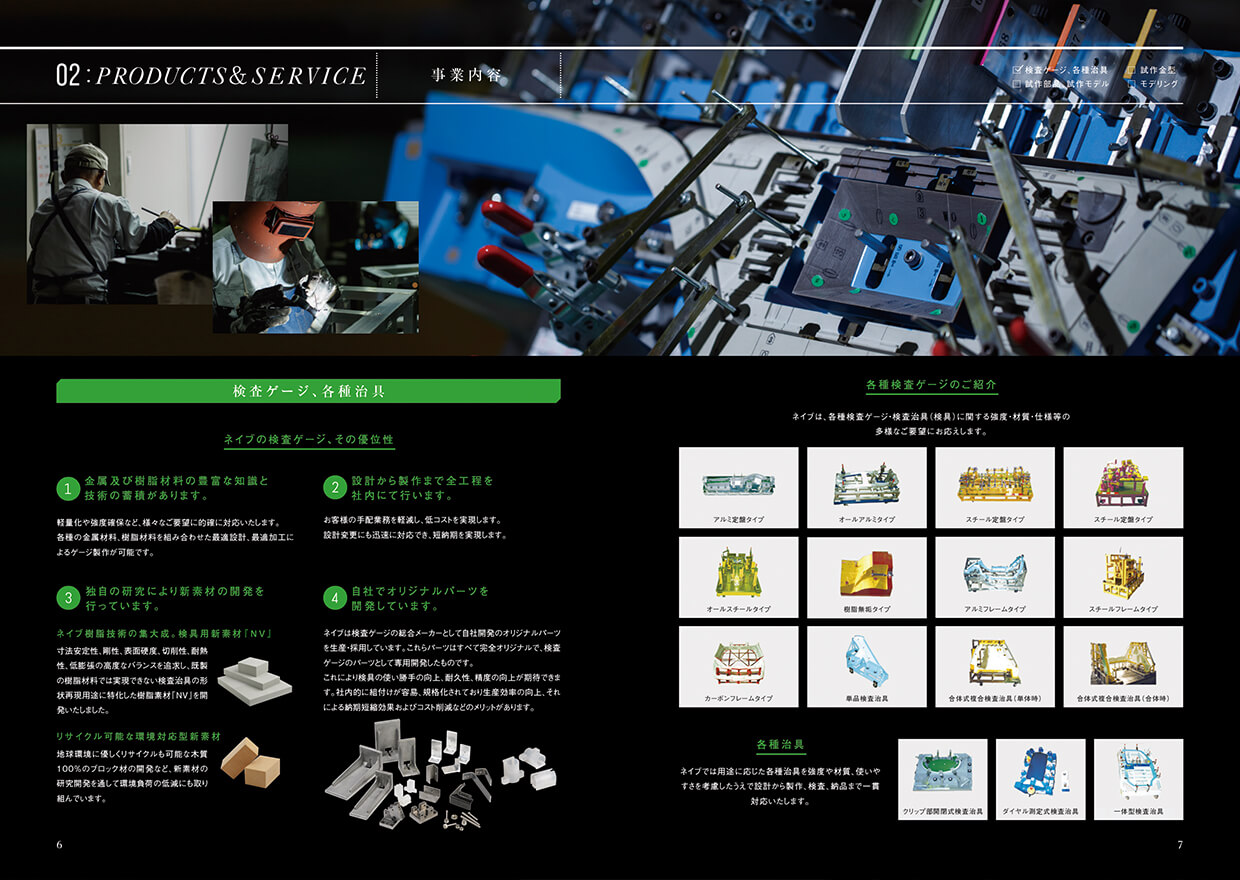 自動車をはじめ様々な工業製品向けの検査ゲージや治具等の専門メーカー、株式会社ネイブ様。コーポレートサイトのリニューアルと会社案内パンフレットを制作させていただきました。NEIVEの頭文字に応じた5つのブランドビジュアルでは、写真とキャッチコピーで、ネイブ様の高い専門性と技術力を訴求。また、優秀な新卒者にもきちんとアピールできるよう、コーポレートカラーでもあるグリーンを基調としたスッキリとしたデザインとさせていただきました。ネイブ様の素晴らしい技術力が、これからも日本のものづくりに寄与されることに期待しています。