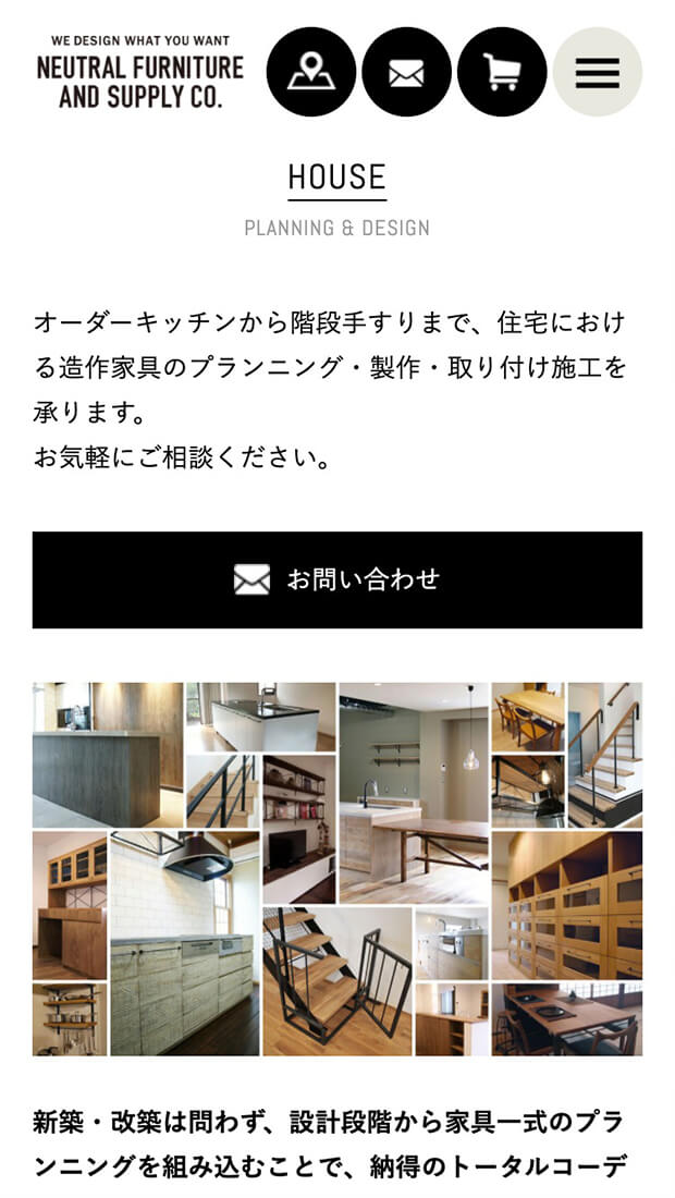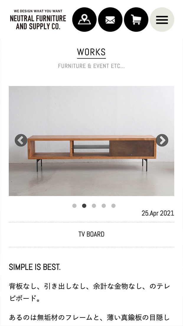 濱田健慈氏が率いる家具製作集団「NEUTRAL FURNITURE AND SUPPLY CO.」「木」と「鉄」をベースに、使えば使うほど愛着が湧く、作品に虜になるファンも多い。サイトでは、ファーストビューでその世界観を伝えるイメージ重視とし、セカンド、サードシーンでより詳しくオリジナル家具を知っていただける構成となっております。また、オンラインショップも同時にオープンし、新たな事業展開へ期待が高まっている。BRESTのオフィスでもNEUTRALの家具を愛用しております。