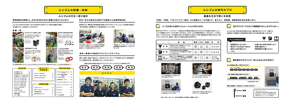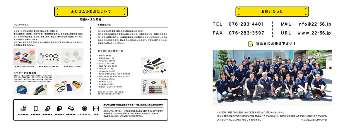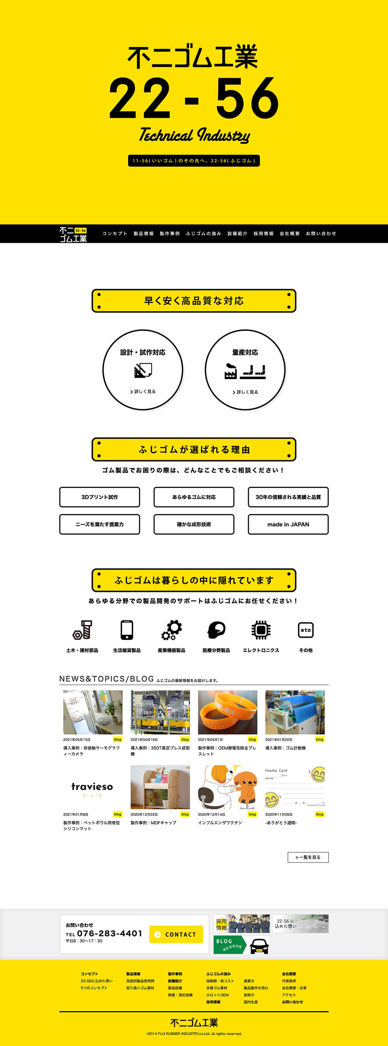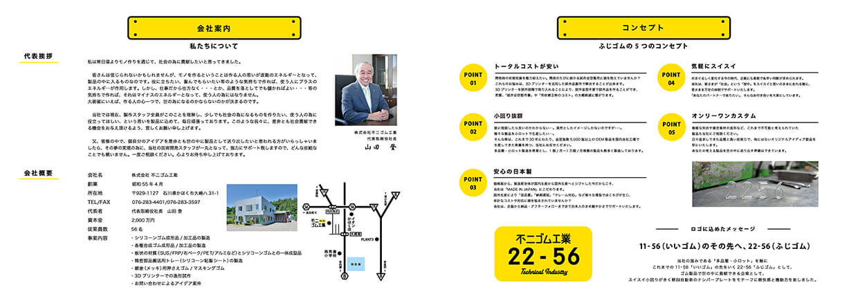 ゴム製造・加工を行う「不二ゴム工業」様。弊社と出会った時は、既にHP制作を別の企業様と進められていましたが、想いが伝わらず悩みを抱えていらっしゃいました。そこで、HPの表面的なデザイン部分の前に、まず、時代に合わなくなっていた、ロゴマークをはじめとした企業ブランドの再構築から着手させていただきました。キービジュアルにあたるコンセプトは、ゴム製造企業では電話番号の下4桁を1156にする会社が数件あることを知り、「11-56(いいゴム)のその先へ22-56(不二ゴム)」のスローガンを立て、多品種小ロット製造を得意とするスタイルと日本製の軽四自動車のスタイルが似ていることから、それらを組み合わせたブランドコンセプトを策定しました。他の同業者の中に埋もれない印象を打ち出し、これまで使ってきた昔からのロゴマークを一新。合わせてWEBから各グラフィック制作まで一貫して制作させていただきました。ゴム加工・製造にとどまらず、3Dプリンターによる造形製作にも力を入れられ、強みと自社カラーを打ち出した今後の展開に期待大です。
