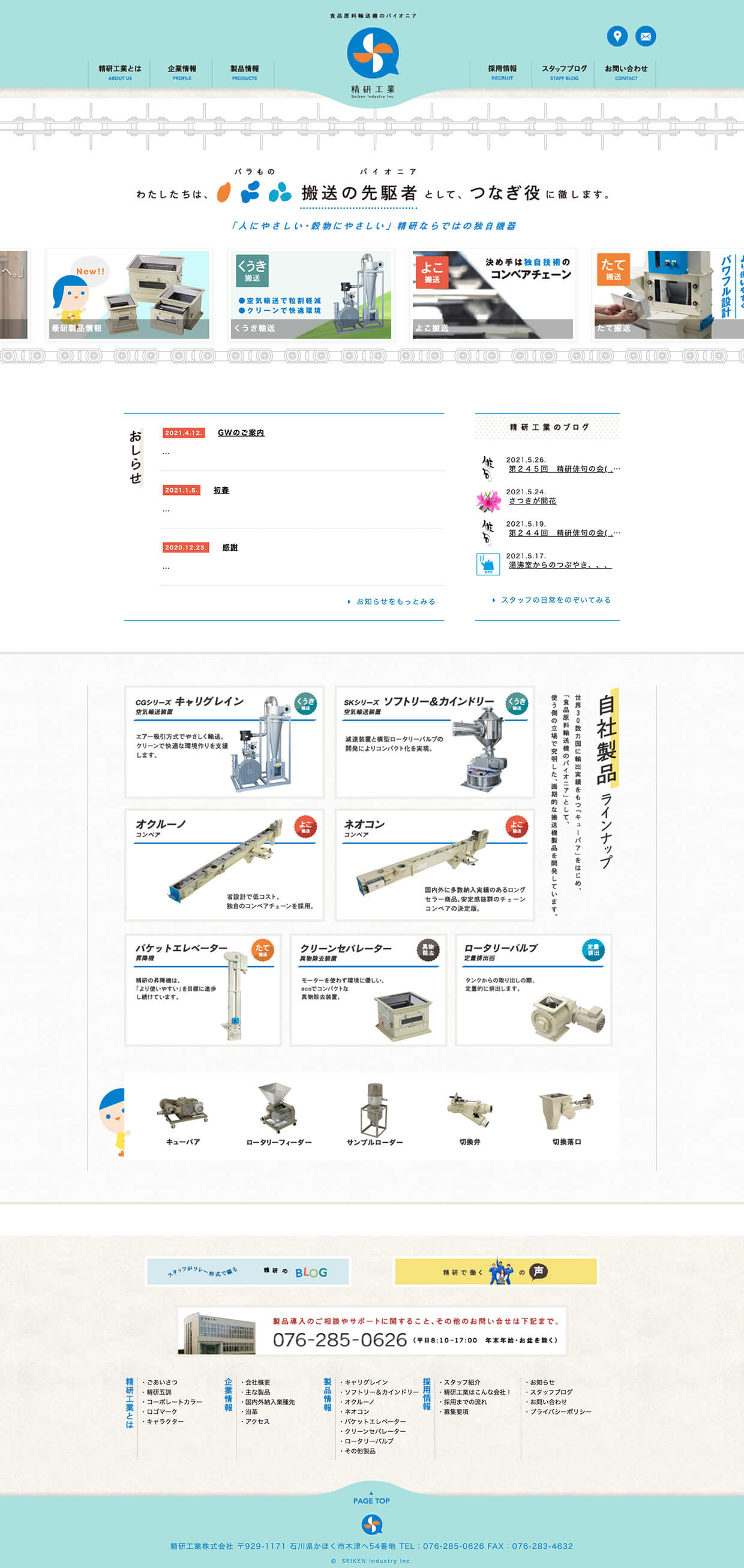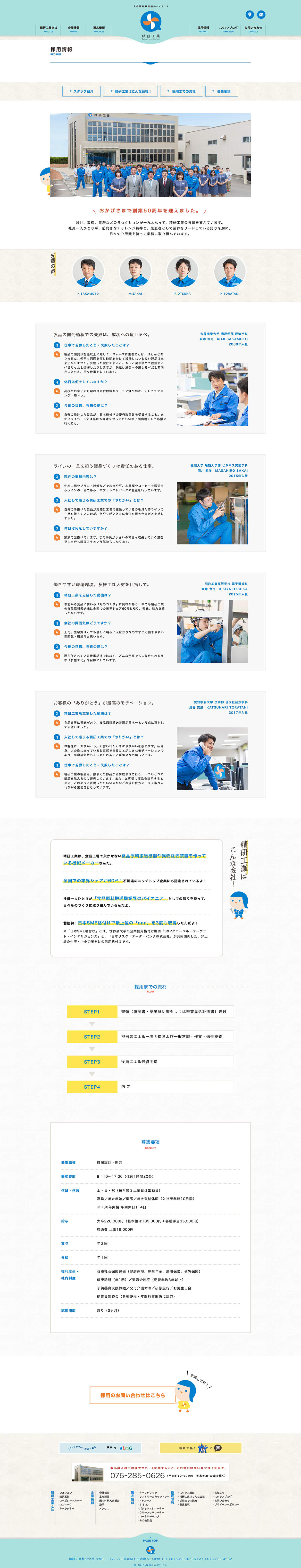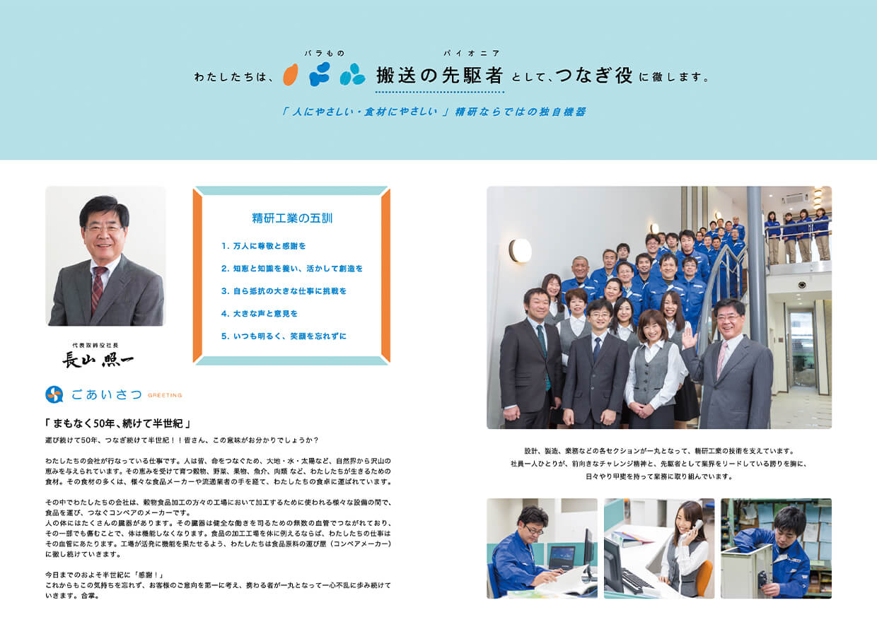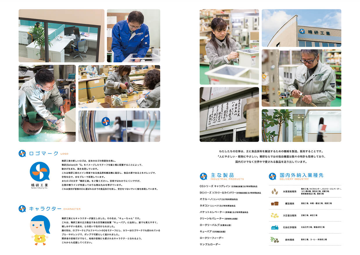 食品原料輸送機のパイオニア「精研工業 株式会社」様。これまでの社風は、一部に昭和レトロな温かい雰囲気があり、それが良い状態で社風として残っておりました。そのテイストを”これからも残していく、”独自の特徴”として踏襲しつつ、これからの50年を見据えた革新性も意識したブランディングをさせていただきました。本社新築に合わせ、ロゴのリニューアルに始まり、Web・グラフィックツール・映像に至るまで、トータルで制作を行っております。また、実際の製品にも策定したオリジナルカラー「精研ブルー」を塗装し、制服や社章、社内ツールもすべてデザイン連動を図られております。これまで以上に自分たちが勤めている会社を好きになり、家族や周りの人にも誇れるブランドが心の中に醸成されてきています。
