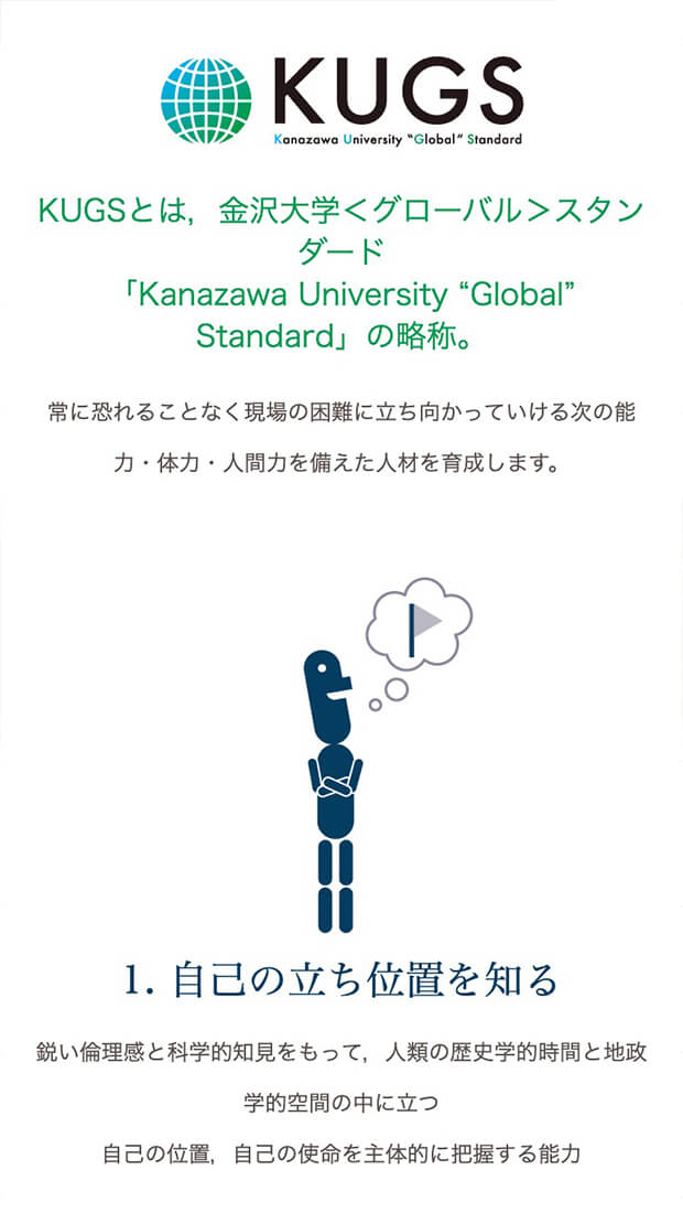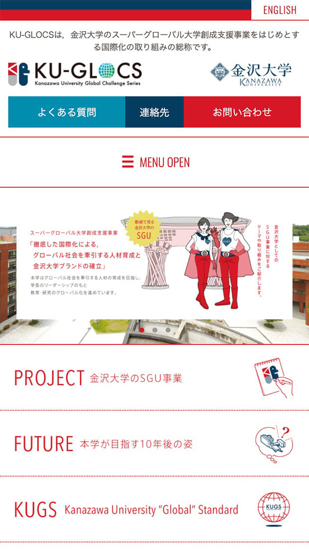 金沢大学様における国際化への取り組みプロジェクトをブランディングさせていただきました。企画段階からご一緒し、象徴となるロゴからイメージキャラ・Web構築(日本語版・英語版)・グラフィックツール・映像制作などトータルで制作。今後、継続的な発信により学生や関係者に浸透していく方向です。金沢大学様のメインカラーは「紺」で、今回のSGU事業は様々なプロジェクトの中でも重要な位置にあたるため、対局となるカラー「赤」をキーカラーとし、キャラクター設定などにより、取っ付きにくい内容も興味を惹かれるようなデザインで、ブランディングさせていただいております。これから入学されるであろう学生への訴求と既存学生への浸透、また関係機関、関係者への認知など、ターゲットは多岐にわかれますが、特徴にフォーカスした一貫性で印象づけを行っております。