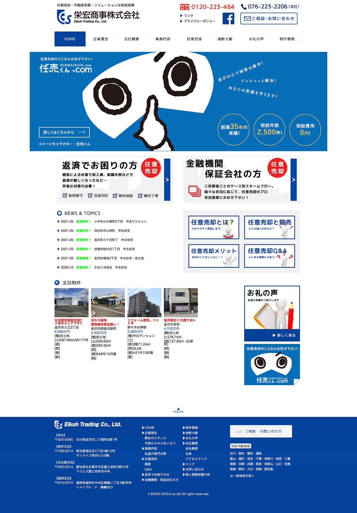 任意売却のあらゆる複雑なケースも解決してきた、知識、経験、実績が強みの「栄宏商事」様のサイトを制作させていただきました。コーポレートサイトの位置づけでありながら、任意売却に特化した内容としており、より対象を絞ったものになっております。北陸のみならず、関東、近畿、中部、九州エリアでも対応されている、プロの不動産会社です。また、ウェブ・ブランディングとしてスマホ対応やWordPress管理にて、運用されております。