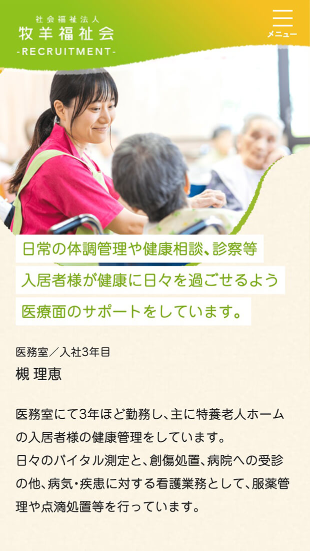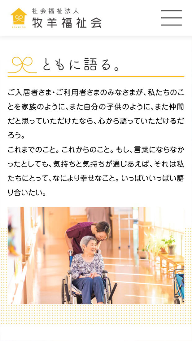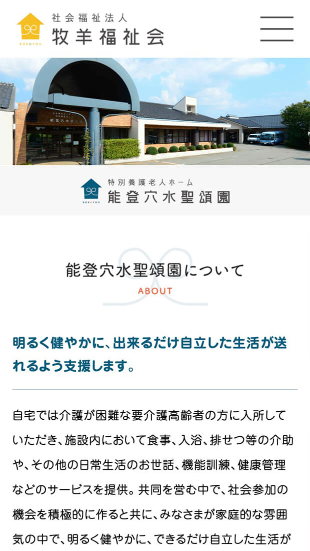 穴水町で能登穴水聖頌園を中心に、総合的に介護福祉サービスを提供されており、今回ロゴ・HP・求人案内パンフの制作をさせていただきました。4拠点ある施設は、どこも自然豊かな気持ち良い環境にあり、施設の説明だけでなく近隣の環境もお伝えしたく、撮影させていただきました。介護施設のブランディングの場合、利用者様へのプライバシーに最大限配慮を行いながら進めることになります。また、地域に愛されている雰囲気をサイトなどでも表現したく、やさしいタッチのイラストをアクセントに柔らかさを表現しております。
